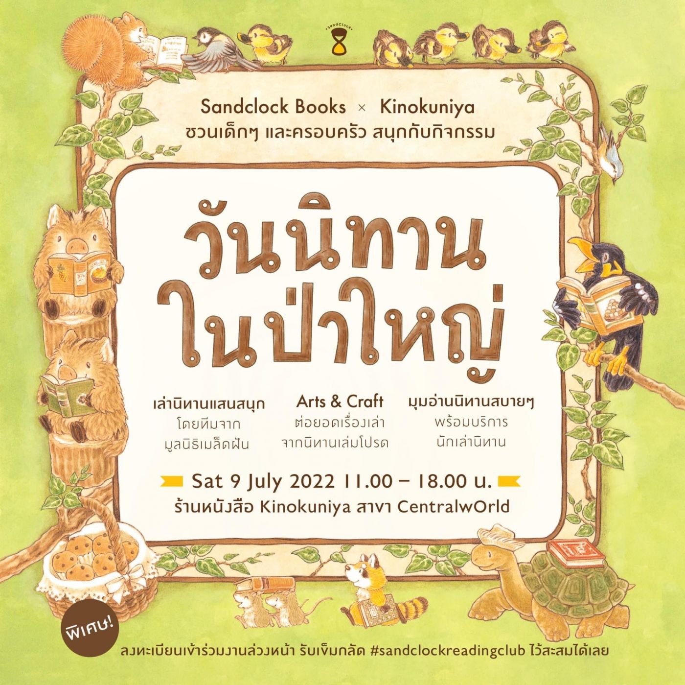 วันนิทานในป่าใหญ่เป็นกิจกรรม Reading club ที่ทางสำนักพิมพ์มีแผนว่าจะจัดขึ้นในทุก ๆ เดือน เป็นการ collabs กันระหว่าง Kinokuniya กับ Sandclock กิจกรรมหลัก ๆ จะมี 2 อย่าง คือ ฟังนิทานและงานประดิษฐ์