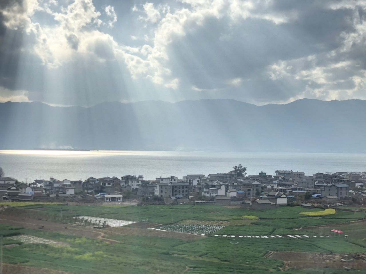 เมืองที่นั่งผ่านแล้วเราชอบที่สุดถึงกับเอา Map ขึ้นมาดูว่าตรงนี้คือเมืองอะไร คือ Dali Bai เป็นเมืองที่มีทะเลสาปใหญ่โตมาก ข้างหลังเป็นภูเขา แล้วตอนนั้นเป็นช่วง 5 โมงเย็น แสงที่ทะลุผ่านก้อนเมฆแล้วสะท้อนลงบนน้ำ ระยิบระยับมากเลยแหละ