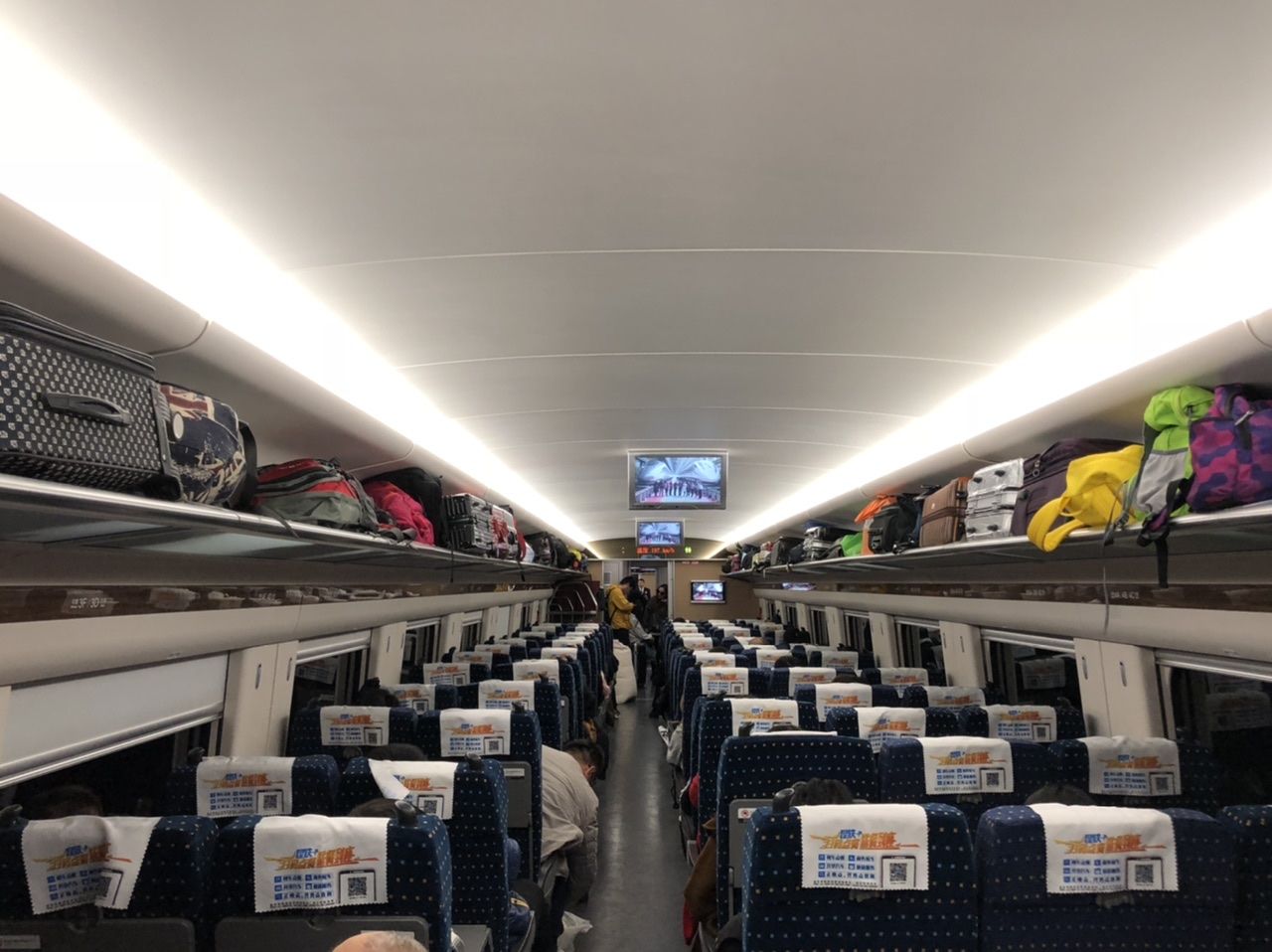 บรรยากาศบนรถไฟดีมาก เราเคยชินกับรถไฟไทยและไม่เคยไปประเทศเจริญแล้ว เช่น ญี่ปุ่น พอมาเจอแบบนี้ก็ว้าวมาก รถไฟตรงเวลาเป๊ะ ห้องน้ำสะอาดดี จะเห็นได้ว่ามีที่นั่งแบบ 3 และ 2 เราโชคดีที่ได้นั่ง 2 กับพี่สาว ตลอดทางบนรถก็ไม่วุ่นวายเสียงดังอะไรเลย