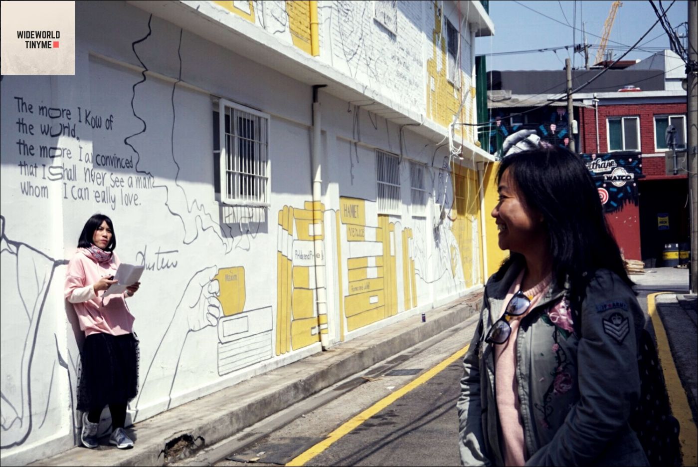 โดยกำแพงนี้เอาเข้าจริงๆนะไม่ได้หาได้ง่ายๆหรอก ให้คุณลองนึกดูว่า ถ้าเราอยู่ย่านบางพลัดแล้วมีนักท่องเที่ยวมาถามหากำแพงหน้าตาตามภาพในละครสักเรื่อง เราจะนึกออกไหม เพราะถึงเราจะอยู่ย่านบางพลัด เราก็คงไม่ได้รู้จักทุกที่ในย่านนั้นใช่ไหมล่ะ ซึ่งอันนี้ก็เหมือนกัน กำแพงนี้อยู่ในย่านซองซู (Seongsu) และกว่าเราจะหาเจอ เราถามคนเกาหลีไปสามคน แถมคนที่สามที่นำทางให้เราระดับหนึ่งก็ไม่ได้ทำให้เราเจอจริงๆหรอก แต่ด้วยความที่ลุงยักษ์กับลุงยมคงจะเข้าใจจิตใจความติ่งเลยดลบันดาลให้ในที่สุดเราก็ได้เจอ ตอนเจอนี่อย่างดีใจสุดๆ