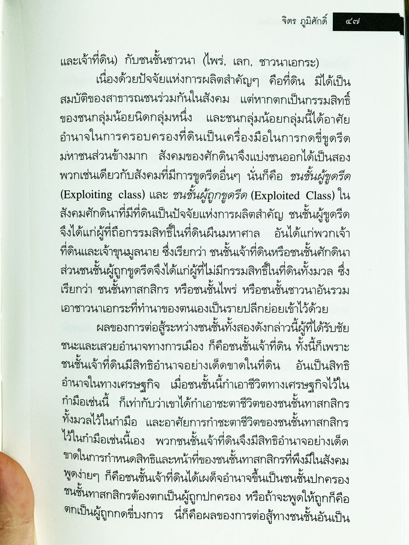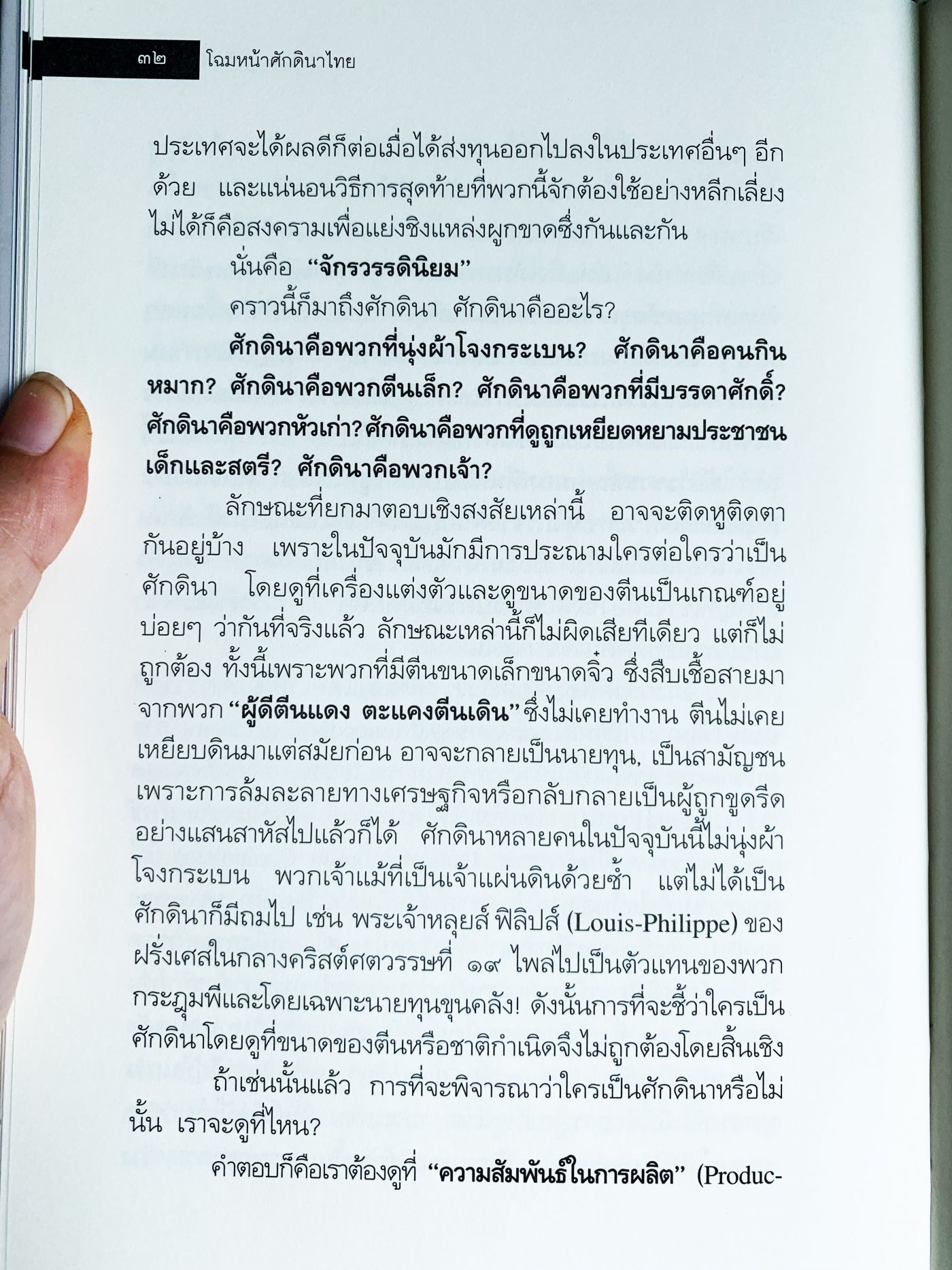 โฉมหน้าศักดินาไทย แค่เปิดชื่อหนังสือมาก็พอเดาได้ว่าจะเล่าเรื่องถึงใคร โดยเปิดเรื่องมาจะพูดถึงคำว่า “ศักดินา” มาจากไหน ใครบัญญัติ แล้วมันเกี่ยวกับ “ที่นา” ตรงไหน ซึ่งจากในหนังสือจะเล่าย้อนไปสมัยบรรพกาลเลย สมัยที่มนุษย์ทุกคนยังเป็นเสรีชน โยกย้ายถิ่นฐานไปเรื่อย ไม่ได้อยู่เป็นหลักแหล่ง มีการเปรียบเทียบกับชาติอื่นๆ และมีเชิงอรรถประกอบคำอธิบาย ซึ่งสังคมมนุษย์ทางฝั่งตะวันตกกับไทยก็ไม่ต่างกัน การที่เสรีชนต้องย้ายที่บ่อยเพราะบางทีก็โดนคนจากกลุ่มอื่นโจมตีบ้าง ใครๆก็อยากได้ที่ดี ติดแม่น้ำ ทรัพยากรครบ ทำให้เกิดเป็นผลประโยชน์ทับซ้อนกัน มีการแย่งสิทธิ์ในที่ดิน แย่งกรรมสิทธิ์ในพื้นที่ต่างๆ เสรีชนที่กำลังอ่อนแอ รบราใครไม่เป็นก็จะไปพึ่งกับการเข้าพวกกับกลุ่มทีมีอิทธิพล ครอบครองที่ดินเป็นจำนวนมากกัน เกิดเป็นคำว่าเจ้าที่ดิน ซึ่งอยู่กระจัดกระจายไปตามทิศต่างๆ สุดท้ายแล้วจะเหลือเพียงแต่พวกเจ้าที่ดินใหญ่ๆที่ต้องมารบรากันเอง โดยจะเหลือเพียงหนึ่งนั่นก็คือที่มาของกษัตริย์ในอดีต การรบราถ้าฝ่ายใดฝ่ายหนึ่งแพ้ อีกฝ่ายก็จะเข้ายึดที่ดิน และกำลังคนของอีกฝ่าย พวกนี้จะถูกจับมาเป็นเชลย เป็นทาส ใช้แรงงาน ชีวิตก็จะวนลูป ทำงานเพื่อให้ได้กินและกินเพื่อให้มีแรงทำงาน ส่วนเงินเดือนอะไรนั้นไม่มี การมีชีวิตอยู่ของทาสคือการใช้แรงเพื่อนายเท่านั้น ส่วนพวกคนทั่วไปชาวบ้านธรรมดาจะเรียกว่าไพร่ การเป็นไพร่ที่ว่าเป็นไทนั้นก็ไม่ได้หมายความว่าจะมีชีวิตที่ดี
