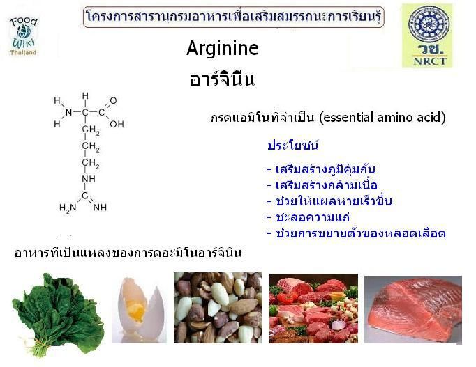 อาร์จินีน (arginine) เป็นกรดแอมิโนชนิดหนึ่งและในทางโภชนาการจัดเป็นกรดแอมิโนที่จำเป็นสำหรับทารกและเด็กที่กำลังเจริญเติบโต L-Arginine จะกระตุ้นให้ร่างกายผลิต ไนตริกออกไซด์ เพื่อช่วยในเรื่องการขยายตัวของหลอดเลือด รวมทั้งกระตุ้นการหลั่งโกรทฮอร์โมน ซึ่งเป็นฮอร์โมนสำคัญในการคงความเป็นหนุ่มเป็นสาว ช่วยชะลอความแก่ อาร์จินีนบริสุทธิ์ ละลายในน้ำได้ดีมาก และมีสมบัติเป็นเบสที่มีประจุบวก