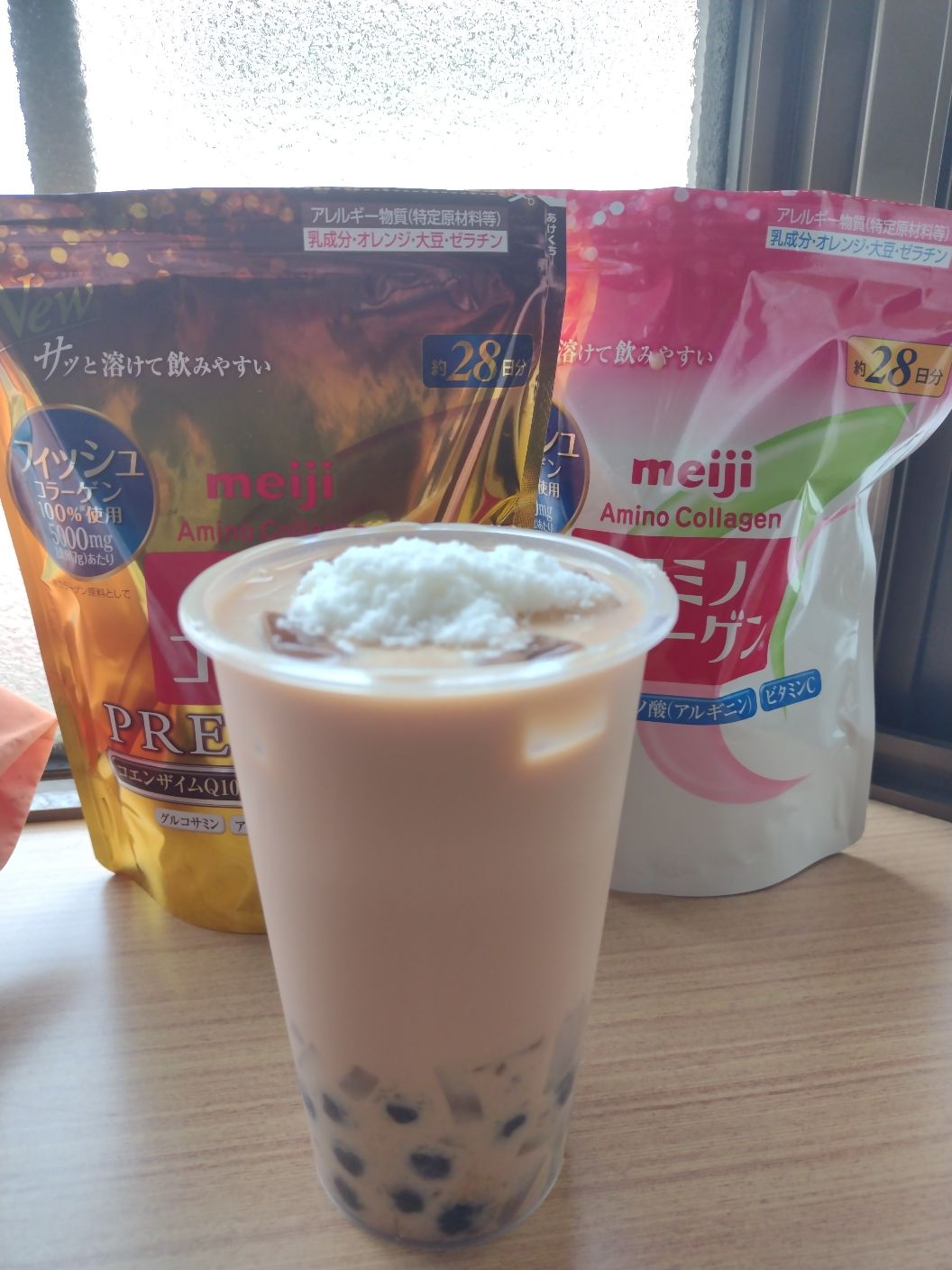 แต่นแต้นนนนนนนนน ดิส อิส อะ ชานม ไข่มุกกกกก 555555...อ่ะ สารภาพเลย ที่แนะนำเพราะส่วนตัวชอบดื่มชานมค่ะ แค่นั้น 55555 เอ้าาาา ก็บอกแล้วไง ว่าMeiji Amino Collagen เมื่อนำไปผสมแล้ว มันไม่มีสี (ยกเว้นชามะนาวที่ชิจิใส่) รส กลิ่น เพียงแต่ตอนผสมในชานมไข่มุก อาจเพราะในชามีน้ำแข็งล่ะมั้ง เลยทำให้คอลลาเจนละลายช้า แถมถ้าคนไม่ดี จับตัวเป็นก้อนด้วยนะ แต่ชิจิชอบดื่มชานมค่ะ เลยอภัยให้ได้ 5555 ฉะนั้นแค่นำไปผสมในเครื่องดื่มหรืออาหารที่เราชอบ ก็ทำให้มื้อนั้นเป็นมื้อที่เราเลิฟที่สุดแล้ว เพื่อน ๆ สามารถไปหาซื้อแล้วมาลองผสมในอาหารดูแล้วนำมาอวด ๆ หรือเม้ามอยกันได้นะคะ :)