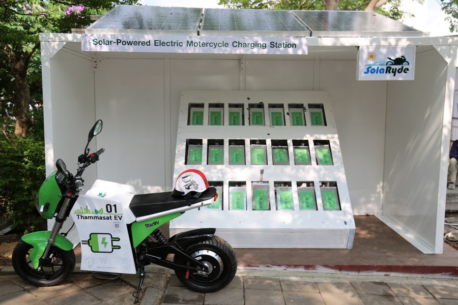 อย่างที่เรารู้ ๆ กันว่า มหาวิทยาลัยธรรมศาสตร์ มีความมุ่งเน้นในการที่จะพัฒนามหาวิทยาลัยสู่การเป็น Smart University ที่มีการใส่ใจคุณภาพชีวิตและสิ่งแวดล้อม โครงการหนึ่งที่เรารู้จักกันดี คือการติดตั้งแผง Solar Cell ทั่วมหาวิทยาลัยเลย ทั้งบนอาคาร และบนรถรับส่งนักศึกษาภายในมหาวิทยาลัยฯ รวมถึงมีโครงการต่าง ๆ ที่ส่งเสริมให้นักศึกษามีจิตสำนึกรักสิ่งแวดล้อม และวันนี้เอง ทางมหาวิทยาลัยธรรมศาสตร์ ก็ได้เปิดตัว "SolaRyde" วินมอเตอร์ไซต์แนวใหม่ ใช้จักรยานยนต์ไฟฟ้า แน่นอนว่า สารพันเรื่องราวในบ้าน มธ. ก็ไม่พลาดจะนำมาฝากกันครับ