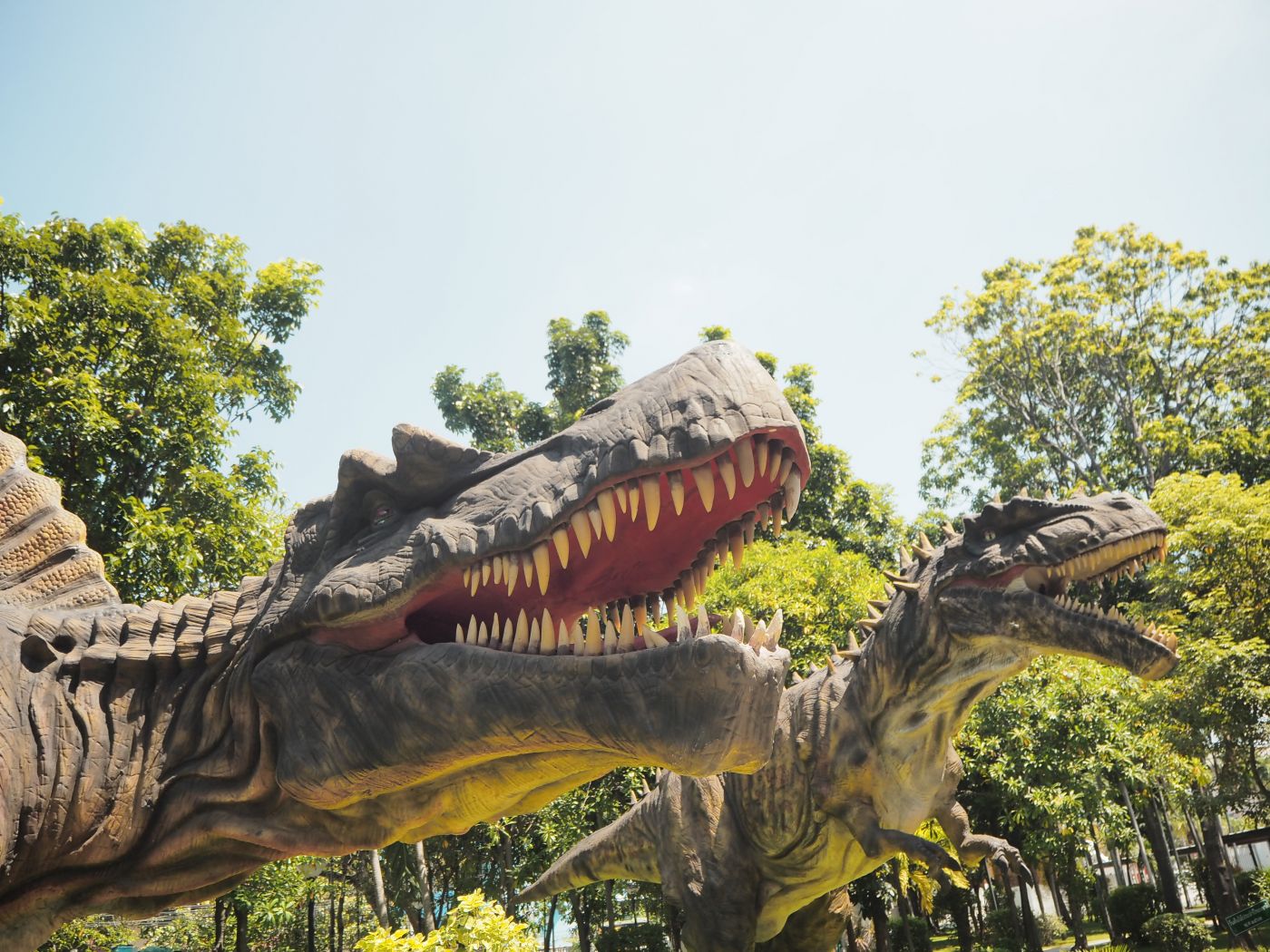 จอดรถและเดินมายังทางเข้า ผ่านไดโนเสาร์กินเนื้อตัวเขื่องสองตัว โอ้โห ทำได้ดี ดูสมจริงทีเดียว เดินผ่านแล้วเข้ามายังอาคาร