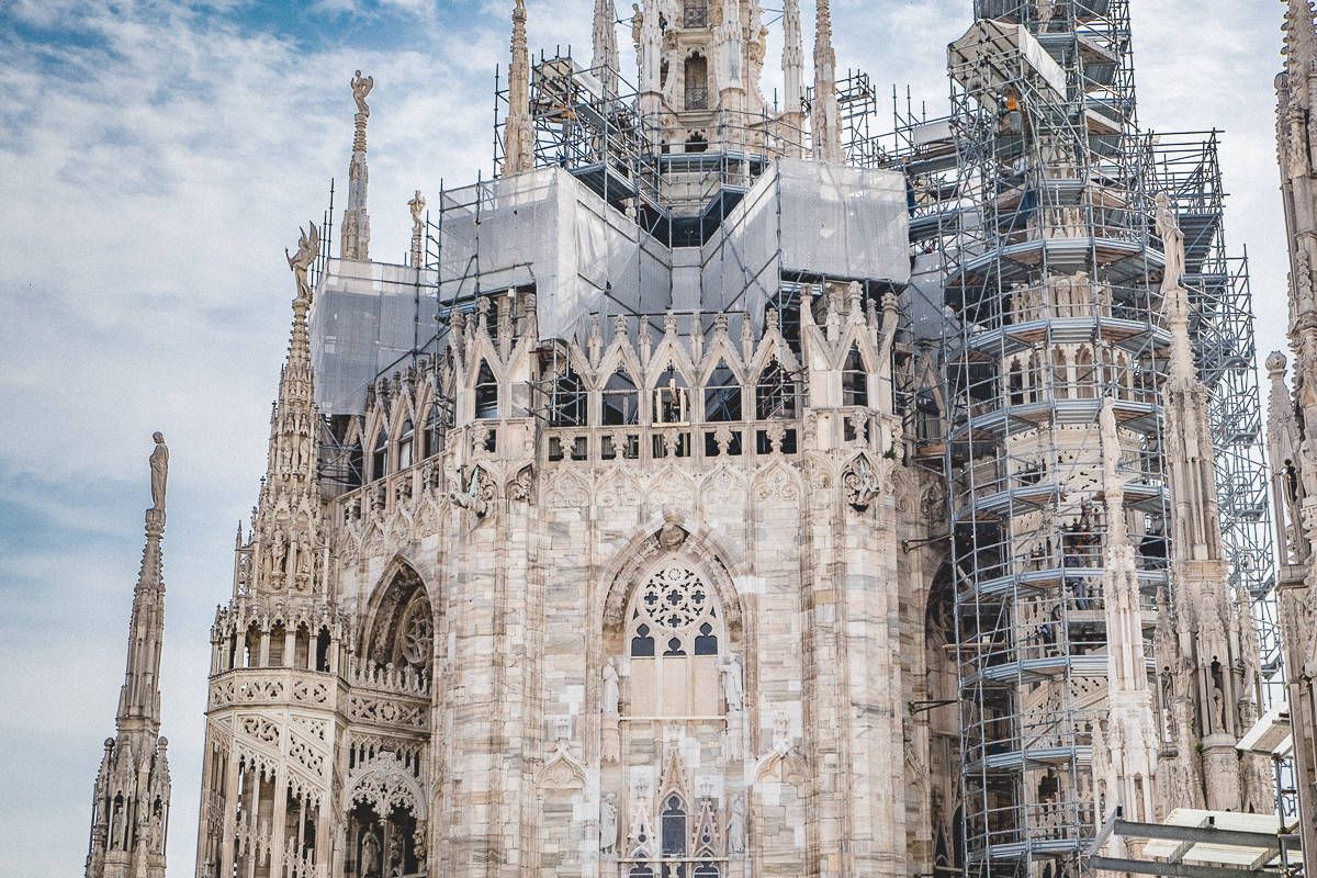แหม่! เรื่องบังเอิญแบบนี้ไม่ได้มีแค่ในประเทศไทยหรอกนะคือตอนแรกไม่ได้ก่ะจะเล่นใหญ่หรอก แต่ทำไปทำมาชักจะมันมือ โปรเจคเริ่มบานปลายสเกลใหญ่โตขึ้นเรื่อยๆ จากใช้หินธรรมดา ก็กลัวจะแกรนด์ไม่พอ เลยเปลี่ยนมาใช้หินอ่อนขาวสวยอมชมพู (นี่แน่ใจนะว่าหินอ่อน) นำเข้าจากเมือง Candoglia และปริมาณที่ใช้มันเยอะมากจนต้องลงทุนขุดคลองขึ้นมาเพื่อลำเลียงหินอ่อนที่สกัดเสร็จแล้วเข้ามาที่มิลาน