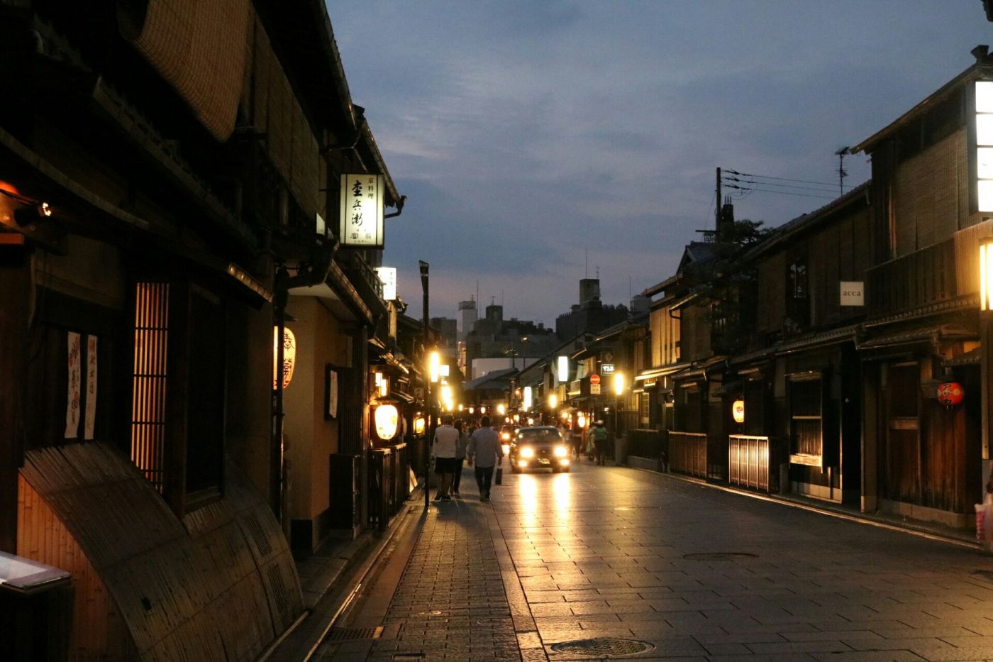 เมื่อเราเก็บของเข้าที่พักเรียบร้อยแล้วอันดับต่อไปคือการไปหาของกินกันค่ะ โดยเป้าหมายของเราคือที่ย่าน Gion ค่ะ ย่านนี้เคยเป็นสถานที่ที่เกี่ยวกับ "เกอิชา" มาก่อนค่ะปัจจุบันได้กลายมาเป็นสถานที่ท่องเที่ยวแล้วก็ยังมีร้านอาหารเยอะแยะมากมายเต็มไปเลยเหมือนกับมีการผสมผสานระหว่างยุคสมัยโบราณมารวมกับสมัยใหม่ด้วยมันเลยดูมีความชิคๆเก๋ๆไปอีกแบบ ถ้าไปเดินในช่วงเย็นๆหน่อยเราว่าบรรยากาศจะดีมากแต่ว่าเราดันไปเดินตอนหัวค่ำนี่ซิ แต่ก็ได้รับความรู้สึกไปอีกแบบนะเงียบๆสงบๆไม่วุ่นวายดีเหมือนกันค่ะ555