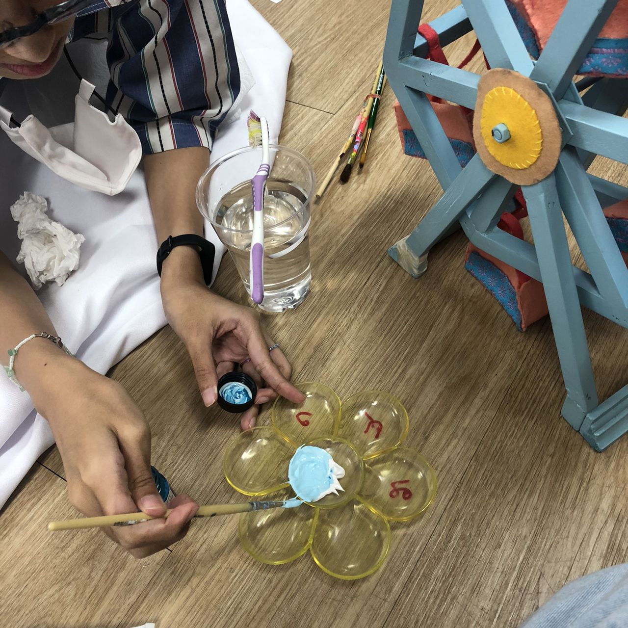 รูปด้านบนคือตอนที่เราช่วยกันซ่อมชิงช้าสวรรค์ของพี่ มีทั้งรอยแตกของไม้และสีลอก น้ำหวานที่เป็นเทพด้านการผสมสีเลยต้องจัดการผสมหาสีที่คล้ายสีเดิมที่สุด ซึ่งน้ำหวานก็ทำได้ ;-;;
