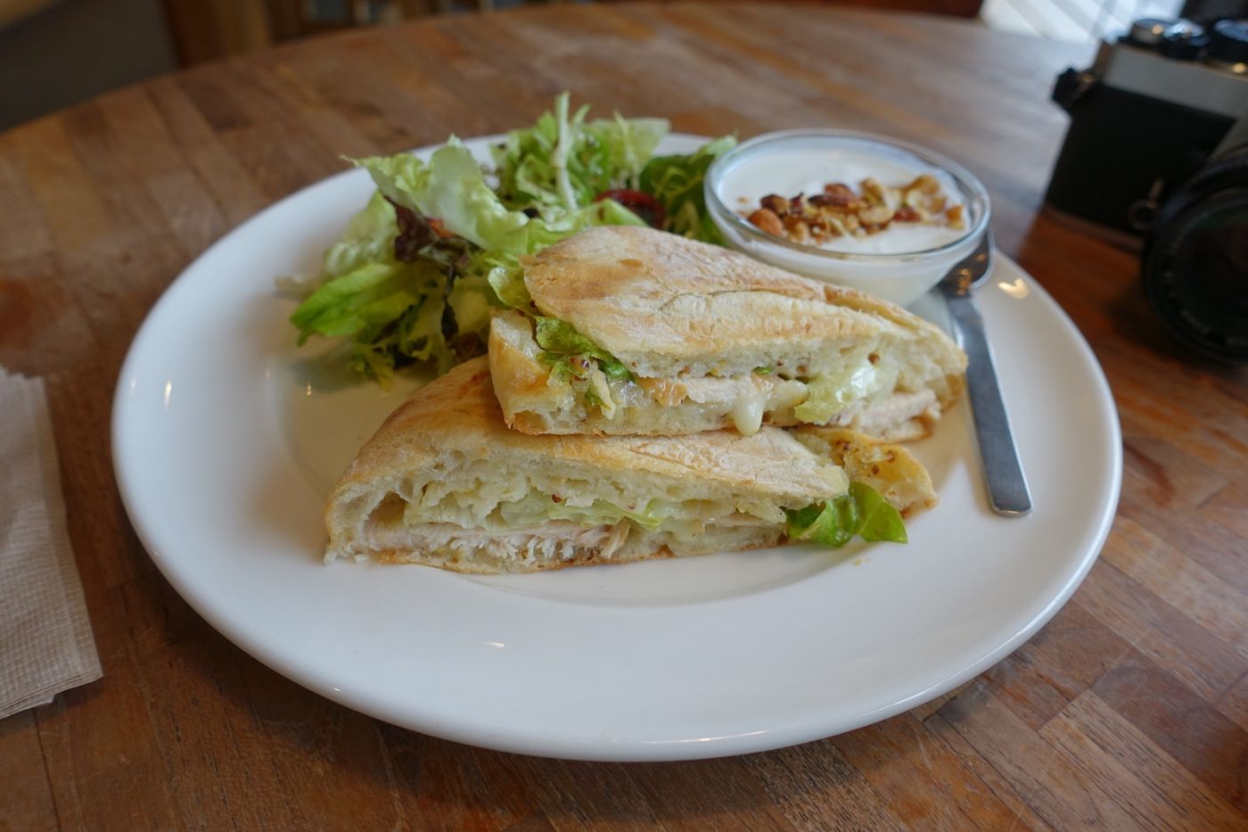 เรามองเข้าไปในร้าน คนเยอะกว่าที่คิดแม้เราจะมาแต่เช้า ตามกูเกิลแมพร้านเปิด 8.30 เรามาถึงร้านประมาณ 9 โมงเศษ ๆ เหลือโต๊ะริมหน้าต่างว่างแค่โต๊ะเดียวนอกนั้นเป็นโต๊ะรวมและเป็นบาร์ด้านหลัง พอสั่งแซนด์วิชมัสตาร์ดไก่กับ Flat White กาแฟก็เลือกได้ว่าจะเอาแบบไหน คั่วอ่อน คั่วกลาง คั่วเข้ม เราเลือกคั่วกลาง พอสั่งเสร็จเรียบร้อยเราก็ดิ่งมาที่โต๊ะทันที