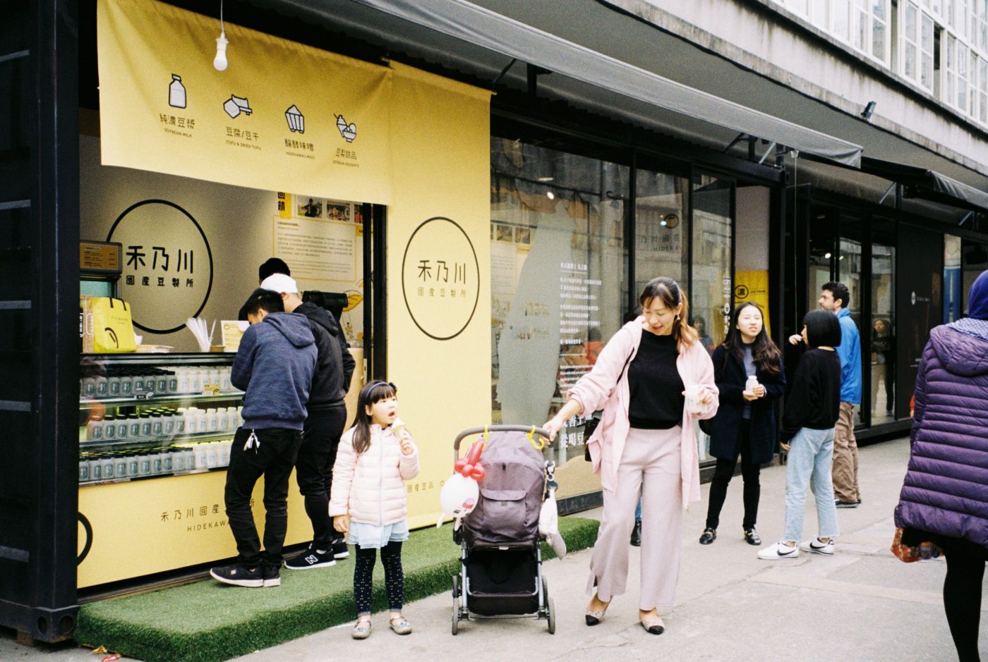 มองซ้าย มองขวา หาร้านอาหาร หรือร้านกาแฟก็ได้ หันไปเจอร้านนึง คนแน่นเชียว ดูแล้วไม่น่าจะมีที่ให้เรา เลยเดินต่อไปอีกนิด สะดุดตากับหน้าร้านสีเหลือง พอเดินเข้าไปดูใกล้ ๆ เป็นร้านนมถั่วเหลือง มีสองหนุ่มกำลังยืนคุยกันอย่างตั้งอกตั้งใจ เห็นเด็กน้อยกำลังกินซอฟต์ครีมอย่างเอร็ดอร่อย เลยตัดสินใจเดินไปต่อแถวบ้าง อย่างน้อยนมถั่วเหลืองก็น่าจะให้โปรตีนอิ่มสบายท้อง