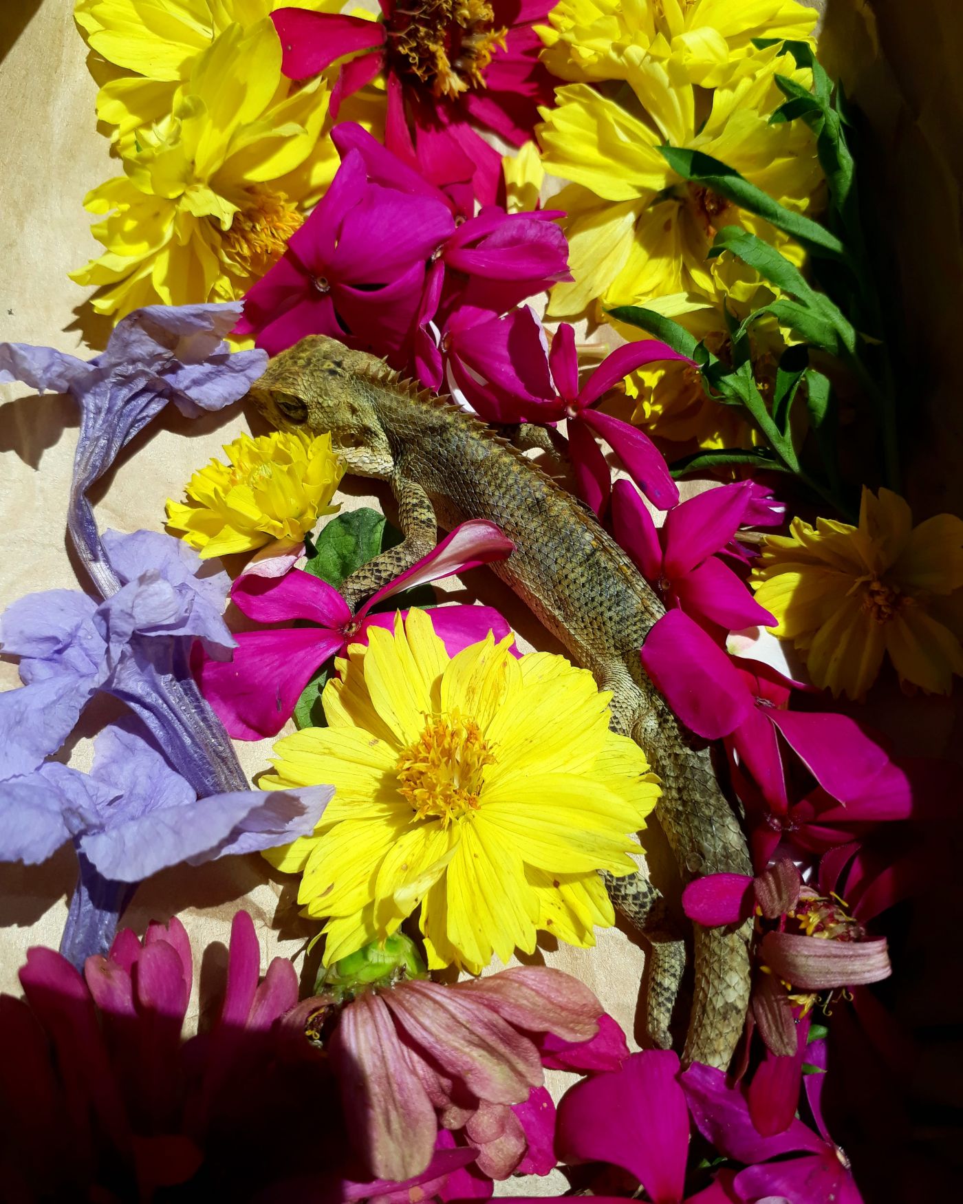 ประดับประดารอบตัวเขาด้วยดอกไม้ที่เราเก็บมาจากสวน