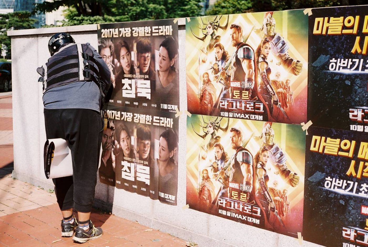 มองเห็นคนกำลังติดโปสเตอร์ Thor : Ragnarok กับ Starwars อยู่ฝั่งตรงข้ามก็วิ่งข้ามถนนไปถ่าย