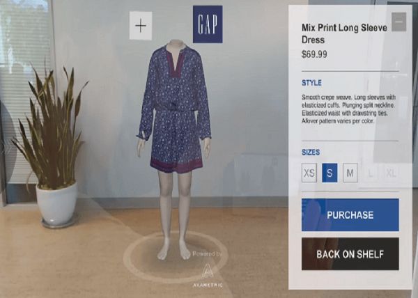 แบรนด์ค้าปลีกเสื้อผ้า fast fashion อย่าง GAP ก็ได้พัฒนา ar shopping app สำหรับลองเสื้อผ้าขึ้นเพื่อดึงดูดลูกค้าเช่นกันแนวความคิดนี้มาจากการรับฟังความคิดเห็นของลูกค้าแล้วจึงนำไปพัฒนาต่อยอด โดยลูกค้าสามารถทดลองเสื้อผ้าที่คล้ายคลึงกับการลองสินค้าจริงที่ร้านได้ผ่านทางแอพ เพียงเลือกแบบของเสื้อผ้าของ GAP ที่ชื่นชอบซึ่งลูกค้าสามารถขยายขนาดเพื่อดูเนื้อผ้าหรือรายละเอียดใกล้ๆได้ จากนั้นระบุน้ำหนักและส่วนสูงเพื่อที่แอพจะสร้าง digital avatar ที่ช่วยทดลองสินค้าขึ้นมา 5 แบบ และแสดงผลผ่านทางหน้าจอโดยลูกค้าสามารถให้โมเดลที่ถูกสร้างขึ้นเดินไปรอบๆเพื่อดูว่าสินค้านั้นๆเป็นอย่างไรหากพึงพอใจก็สามารถสั่งซื้อและนั่งรอสินค้ามาส่งที่บ้านได้อย่างสะดวกสบาย