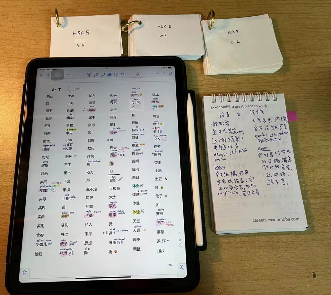 เริ่มที่การกลืนศัพท์ 2500 คำลงไปก่อน แทบจะต้มกินแทน เริ่มจากเราใช้วิธีติ๊กว่าศัพท์ไหนรู้แล้ว ศัพท์ไหนยังไม่รู้ ศัพท์ไหนยังไม่แม่น แบ่งหมวดหมู่ก่อน แล้วเอาศัพท์ที่ยังไม่แม่นและไม่รู้มาท่อง รวมถึงดูตัวอย่างประโยค หาคำตรงข้ามและคำเหมือนของมัน ใช้ทั้งวิธีเอากระดาษปิดความหมาย แล้วใช้สายตาไล่ท่อง รวมถึงใช้วิธีทำ Flash Card ส่วนตัวเราชอบ flash Card มากสุด เพราะข้างหน้าเป็นตัวจีน ถ้าไม่รู้ค่อยพลิกไปดูพินอินและคำแปลด้านหลัง อันนี้เราทำเฉพาะศัพท์ที่ไม่ได้จริงๆ ไม่ทำทุกคำ เพราะ 2500 คำคือทำไม่ไหว แล้วสุดท้าย พอคิดว่าแม่นศัพท์แล้ว ก็เอาศัพท์ทั้งหมด (เอาแต่ตัวจีน) ลง Microsoft Word จัดให้มันมีหลายคอลัมน์ใน 1 หน้า แล้วไล่ทีละตัวเลยว่าตัวไหนยังไม่ได้อีก แล้วก็ทำโน้ต+ไฮไลท์ศัพท์ที่ยังไม่ได้ไว้ สุดท้ายก่อนสอบ เรารู้ศัพท์แบบแม่นเป๊ะประมาณ 80% ของ 2500 คำ