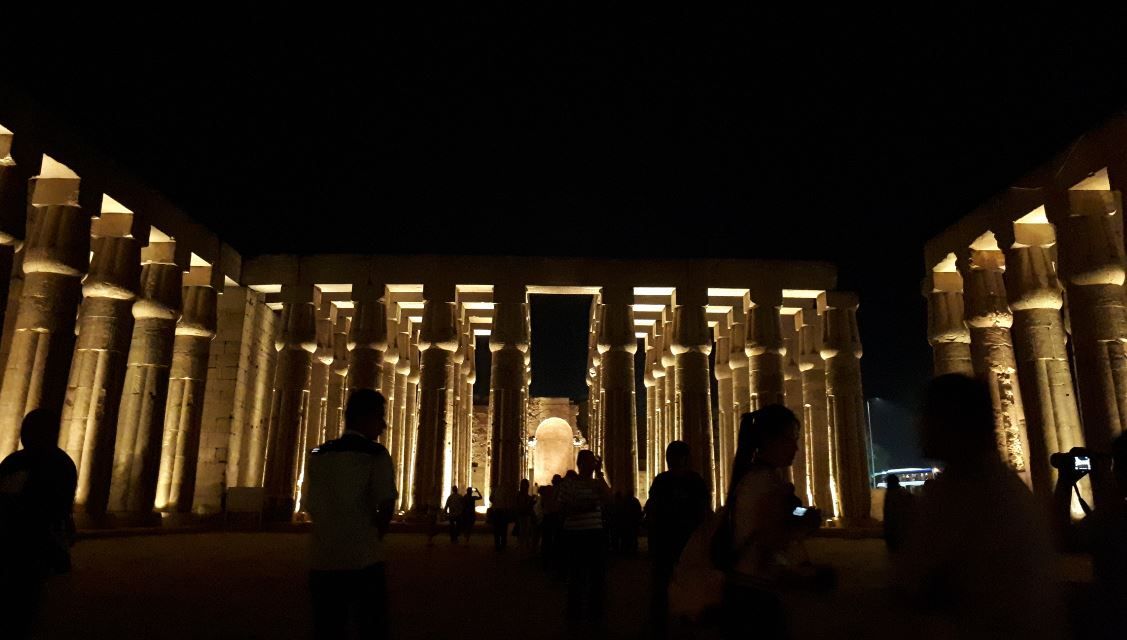 หลังจากทานอาหารเสร็จ พวกเรามุ่งหน้าไปวิหารลักซอร์ยามค่ำคืนกัน ตอนเราทะยอยกันเดินไปวิหาร พี่กิตติก็เอาน้ำอ้อยผูกหนังสติ๊กถุงน้อยๆมาให้คนละถุง แต่ฉันรู้สึกว่าดื่มไม่ไหวเพราะหวานเกินไป ฉันก็ยกให้พี่สาวกินแทน ระหว่างนี้พวกเราก็ยืนฟังพี่โอ๊ตบรรยายเร่ืองวิหารลักซอร์ให้ฟังอยู่บนลานกว้างหน้าทางเข้า วิหารนี้สร้างโดยฟาโรห์อเมโนฟิสที่ 3 เมื่อ 3,000 กว่าปีมาแล้ว ฝั่งตรงข้ามทางเข้าเป็นถนนลาดยาวที่มีรูปปั้นสฟิงซ์ตั้งอยู่ตลอดสาย มีไฟสปอตไลท์ส่องไปตามรูปปั้น น่ามองมาก