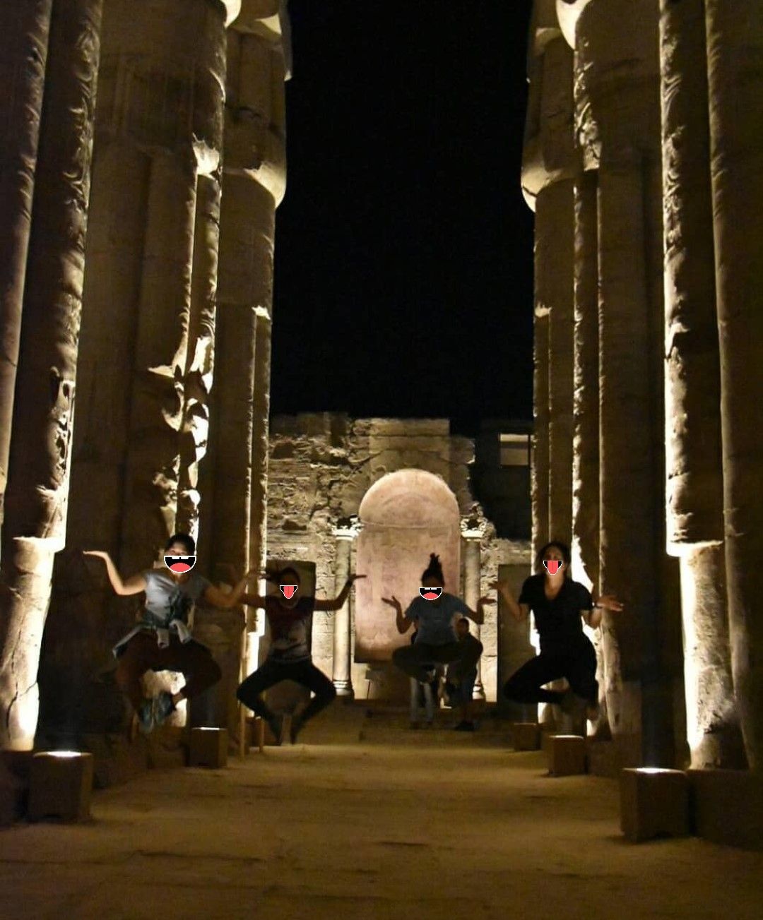 มีอีกมุมหนึ่งที่เราเจอแล้วรู้สึกว่าน่าจะถ่ายรูปสวยก็คือปากทางเข้าอีกที่ ที่มีหินเตี้ยๆหน่อยตรงปากทางตั้งห่างกันอยู่คู่หนึ่ง เราเกิดความคิดพิเรนกันอีกแล้ว เสนอให้ปีนขึ้นไปถ่ายทำท่ากราบบังคมทูลคู่กันไหม? แน่ละว่าเราไม่เคยปฏิเสธความคิดบ้าบอของอีกคนหนึ่งเลย มีแต่จะส่งเสริมกันด้วยซ้ำ แต่ก็แอบกลัวนิดหน่อยว่าผีอียิปต์ที่เฝ้าเสาจะมาหลอกหลอนเราไหม แต่มันเป็นหินก้อนหนึ่ง เราปีนขึ้นไปก็ไม่ได้มีอะไรเสียหายเนอะ รีบๆถ่ายรูปแล้วก็รีบไป หลังคิดแล้วว่าปีนไปถ่ายน่าจะไม่เป็นไร เราก็จัดกันไปหลายท่าเลยทีเดียว ฉันคิดว่าอย่างน้อยความคิดพิเรนๆแบบนี้ก็สร้างรอยยิ้มและเสียงหัวเราะให้พี่ๆคนอื่นในคณะ ฉันว่ามันเป็นวันที่น่าจดจำวันหนึ่งเลยทีเดียว