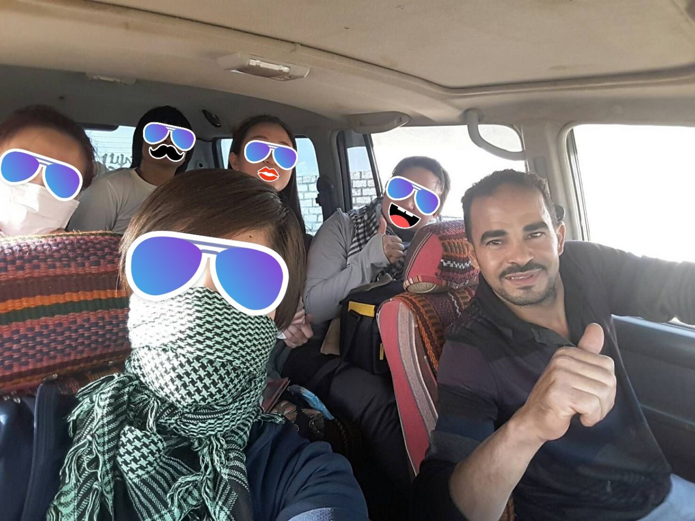 จริงๆก่อนที่เราจะเดินทางกัน พี่กิตติแนะนำว่าให้นำกระเป๋าใบเล็กกว่าเพื่อใส่ของที่จำเป็นต้องใช้ไปแทนที่จะเป็นกระเป๋าลากใบใหญ่ เพราะต้องนั่งรถจี๊ปเข้าทะเลทรายกัน มันจะไม่สะดวกที่จะยัดใส่ท้ายรถ ซึ่งฉันและพี่สาวก็แยกเอาไว้แล้วแหละ แต่ก็ไปดูอีกทีเผื่อว่าต้องการเอาอะไรไปเผื่ออีกจากกระเป๋าใหญ่ โดยกระเป๋าใหญ่จะฝากไว้ที่หมู่บ้านแห่งนี้แหละ ตอนขากลับจากทะเลยทรายค่อยมาเอาคืน หลังจัดการทุกอย่างเสร็จแล้ว พี่ไกด์ก็พาเราไปยังรถที่จะพาเราไปตั้งแคมป์ที่จอดอยู่หลังหมู่บ้าน มีทั้งหมด 5 คัน คันที่ฉันนั่งก็เป็นก๊วนประจำที่นั่งคุยกันบ่อยๆ มีพี่โอ๊ต พี่จ๋า พี่ยูริ พี่สาวและตัวฉันเอง มีแต่คนแย่งกันนั่งข้างหน้า สุดท้ายพี่สาวฉันชนะ สามสาวนั่งตรงกลาง ส่วนพี่โอ๊ตพี่ชายที่แสนดีของน้องนั่งข้างหลังพร้อมกระเป๋า พร้อมเข้าทะเลทรายกันแล้ว!