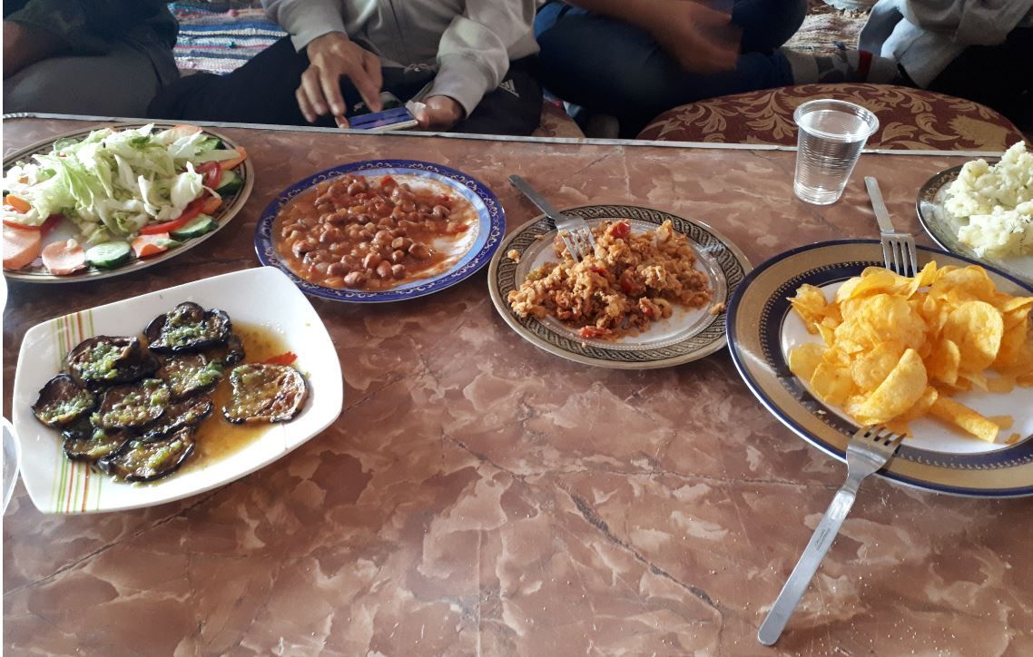 นั่งกันมาได้สักพักใหญ่ก็ถึงจุดพักรถ คนขับรถก็ขอเวลาไปสลับล้อรถบัสก็เลยได้พัก ยืดเส้นยืดสายเสียบ้างหลังจากนั่งกันมานาน บ้างก็กินขนมกัน บ้างก็คุยกัน หลังจากที่รถพร้อมเดินทางอีกครั้ง คณะเราก็มุ่งหน้าไปบาฮารียะห์ โอเอซิส ในหมู่บ้านนี้มีอาหารเที่ยงพื้นเมืองรอเราอยู่ คือเป็นเบาะนุ่มตั้งบนพื้น อาหารก็วางบนโต๊ะเตี้ยๆ วางเรียงกันไปสามสี่โต๊ะ อาหารที่เสิร์ฟก็มีมะเขือม่วงผัด ผักสลัด ถั่วต้มอะไรสักอย่าง มันฝรั่งทอดแกะจากถุง และแผ่นแป้งที่ใช้กินคู่กับกับข้าวพวกนี้