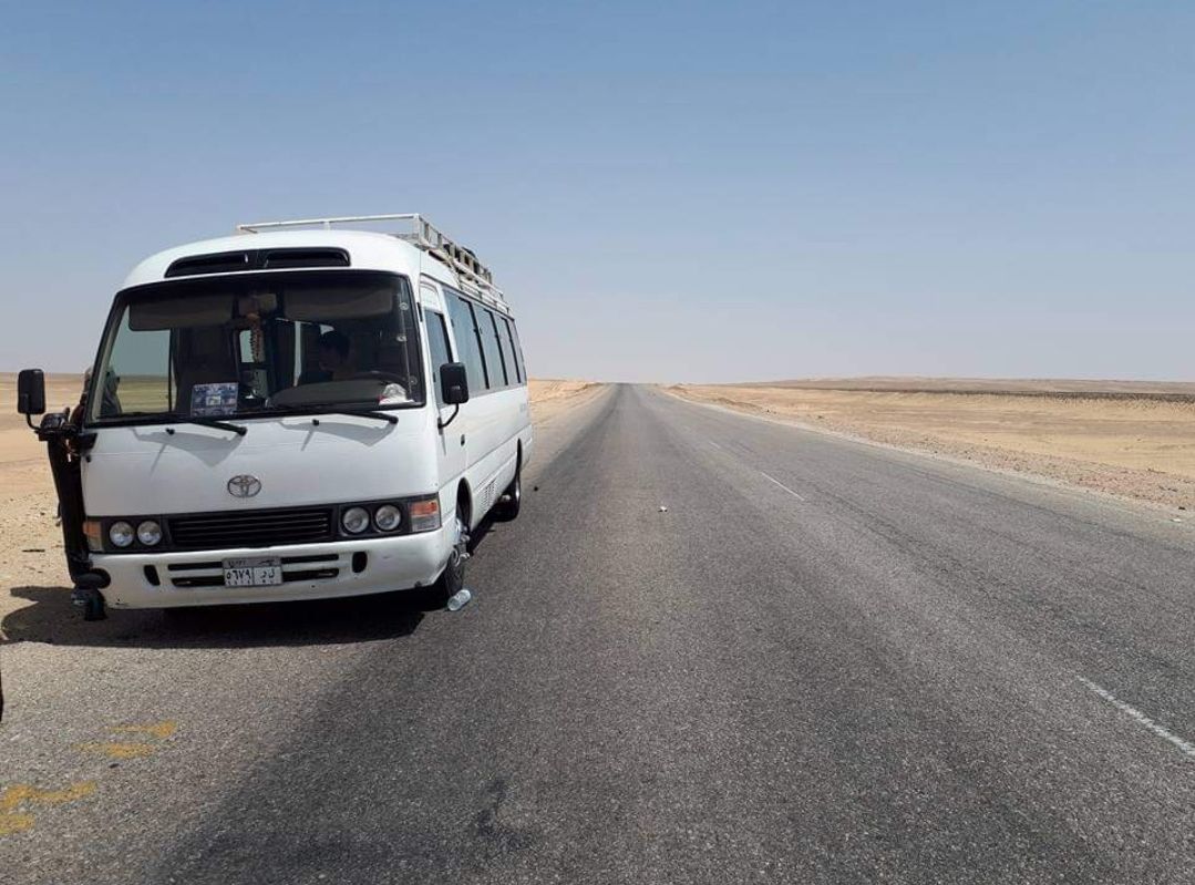 จากที่เห็นเป็นตึกเป็นเมือง เริ่มกลายเป็นวิวทะเลทรายตั้งแต่เมื่อไรไม่รู้ แต่เราใช้เวลาเดินทางนานทีเดียว น่าจะราวๆ 11 โมง จู่คนขับรถก็ชะลอรถแนบข้างทาง ก่อนจะลงจากรถไป ทั้งพี่กิตติและพี่โอ๊ตก็ลงไปดูกัน เห็นคนอื่นทะยอลงจากรถ ฉันก็ลงไปดูบ้าง แจ่มชัดเลยจ๊ะ...ล้อรถฝั่งขวาทั้งล้อหน้าล้อหลังคือยางแบน!!! ว๊อท?! เฮ้ย นี่มันสมพรปากไปหน่อยไหมอะที่บอกว่าเป็นสีสันชีวิต? แต่เราจะไม่ตื่นตระหนกกันค่ะทุกคน คณะเดินทางเราก็มายืนออรอด้านนอกรถกันหมดดูคนขับรถขนของท้ายรถมากองๆไว้ หยิบยางสำรองสองเส้นออกมาจากใต้ท้องรถ ต้องมาเปลี่ยนยางกันกลางทะเลทรายแดดเปรี้ยงๆมันก็เอาเรื่องอยู่นะ แต่เราก็ทำได้แค่ให้กำลังใจน่ะ