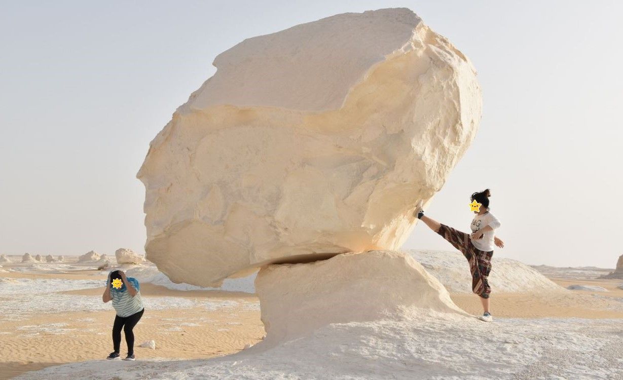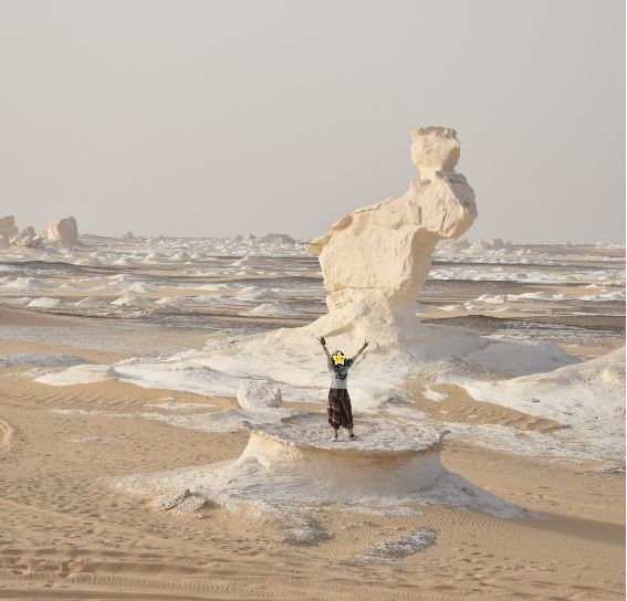 เช้าตรู่ยามฟ้ายังไม่สาง ฉันตื่นขึ้นกลางทะเลทราย หลังจากที่ถ่ายรูปหมู่ดาวไปแล้วฉันก็กลับมานอนต่ออีกสักชั่วโมง อากาศตอนเช้ามืดยังคงเย็นช่ำสบายตัว แต่ที่นี่ก็ไม่มีที่ให้อาบน้ำหรอกนะ ฉันได้แต่ใช้ดระดาษเปียกในการเช็ดชำระกายแทนไปก่อน หลังเช็ดตัวเสร็จก็ไปรับประทานอาหารเช้าง่ายๆที่ทางคณะทัวร์เตรียมไว้ให้ กินเสร็จก็จะนั่งรถไปดูวิวทะเลทรายขาวและหินรูปทรงต่างๆที่เป็นทิวทัศน์ที่เลื่องชื่อของที่นี่ ระหว่างที่รอพี่ๆคนขับรถและทีมงานทานอาหาร พี่กิตติก็แนะว่าหรือจะเดินไปดูก้อนหินเองเลยดีไหม? แล้วค่อยให้เขาขับรถไปรับเราที่โน่น ฉันว่าก็ดีเหมือนกันได้ออกกำลังกาย เดินไปเรื่อยๆแบบมีจุดหมาย