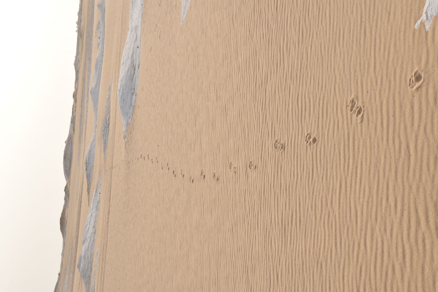 ฉันแว่วๆว่าได้ยินว่าตอนกลางคืนน่ะมีพวกจิ้งจอกทะเลทรายเดินออกมาหากินด้วย พวกเราก็เลยมองหารอยเท้าเจ้าจิ้งจอกน้อยกันใหญ่ และก็เจอด้วย เป็นแค่รอยเท้าเล็กๆน่าเอ็นดู พี่กิตติบอกว่า อืม พวกมันก็เดินมาไกลเหมือนกันนะ เพราะรอยเท้าทอดยาวมาก แต่สุดท้ายก็หายลับไปในดงไม้หรือกอหญ้าที่มีขึ้นประปรายในทะเลยทราย เสียดายเหมือนกันที่ไม่ได้เห็นตัวเป็นๆ แว่วๆว่าแคมป์ของคนอีกคณะเข้าตื่นขึ้นมาตี 2 เพื่อที่จะส่องสัตว์กลางคืนกันเลยทีเดียว