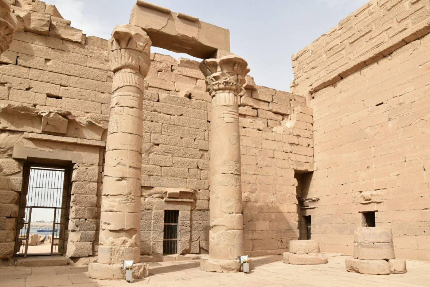 ฉันรีบสะบัดเอาผ้ามาคลุมหน้าทันทีและรีบเร่งเดินผ่านสะพานไม้เพื่อเข้าไปยังตัววิหาร ถึงตรงนี้พี่โอ๊ตก็เริ่มพล่ามเกี่ยวกับโครงสร้างสถาปัตยกรรมของวิหารอยิปต์โบราณให้ลูกทัวร์ฟัง โดยหลักๆแล้ววิหารของอียิปต์จะมีดครงสร้างเหมือนๆกัน จะเป็นออกได้เป็น 3 ชั้น ชั้นแรกสุดคือเป็นลานคอร์ดยาร์ดโล่งล้อมด้วยกำแพง ชั้นที่สองคือเป็นห้องโถงที่มีเสาเรียงเป็นแนว เรียกว่า ไฮโปสไตล์ ฮอลล์ และห้องชั้นในสุดคือห้องบูชาที่อาจจะมีหลายห้องหลายชั้น โดยตั้งแต่ชั้นแรกสุดสู่ห้องชั้นในจะเป็นทางแบบสโลปที่แคบลงๆ ตัววิหารคาลับชาถือว่าไม่ได้ใหญ่โตมากมายอะไร เดินนิดเดียวก็หมดแล้ว แต่ที่เกาะนี้จริงๆยังมีวิหารอื่นอีกหลายแห่ง เพียงแต่เราเลือกที่จะชมแค่วิหารนี้และวิหารใกล้เคียงเท่านั้น