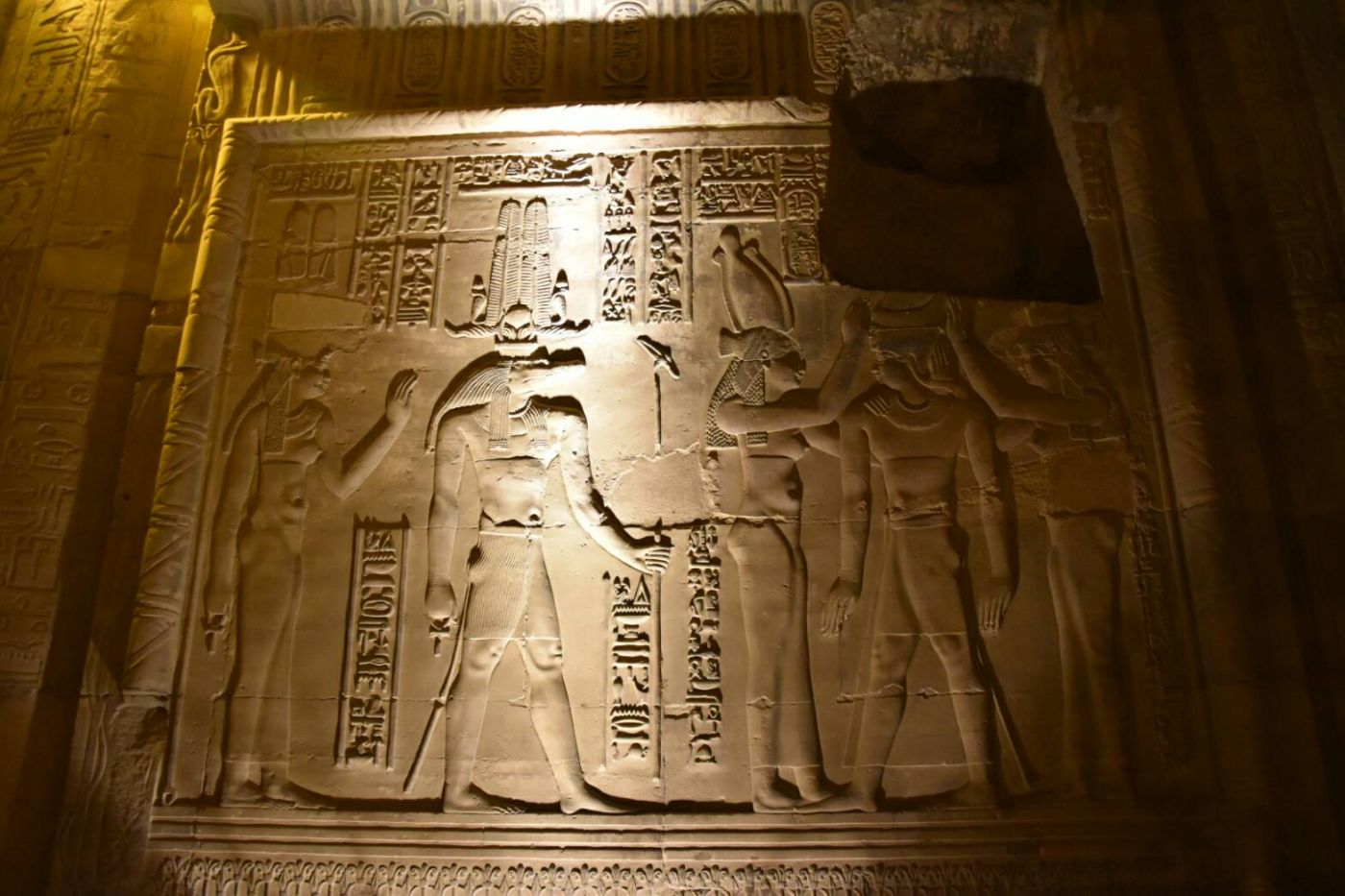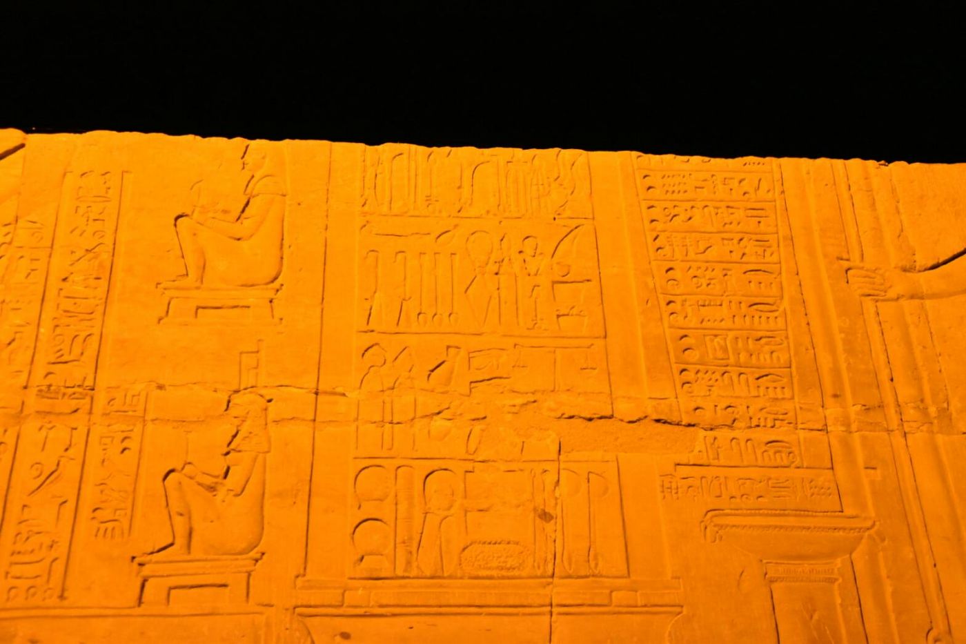 ถ้ามาตอนกลางวันก็คงจะสวยแบบหนึ่ง แต่คณะเรามาถึงตอนกลางคืน วิหารเขาก็เริ่มเปิดไฟก็งดงามไปอีกแบบเช่นกัน ทางเข้าแบ่งออกเป็นสองฝั่ง ฝั่งหนึ่งบูชาเทพโซเบ็ก อีกฝั่งบูชาเทพฮอรัส โดยปกติแล้วจะมีทางเข้าประตูเดียวนะ ไม่ค่อยเห็นวิหารที่ไหนมี 2 ประตูหรอก