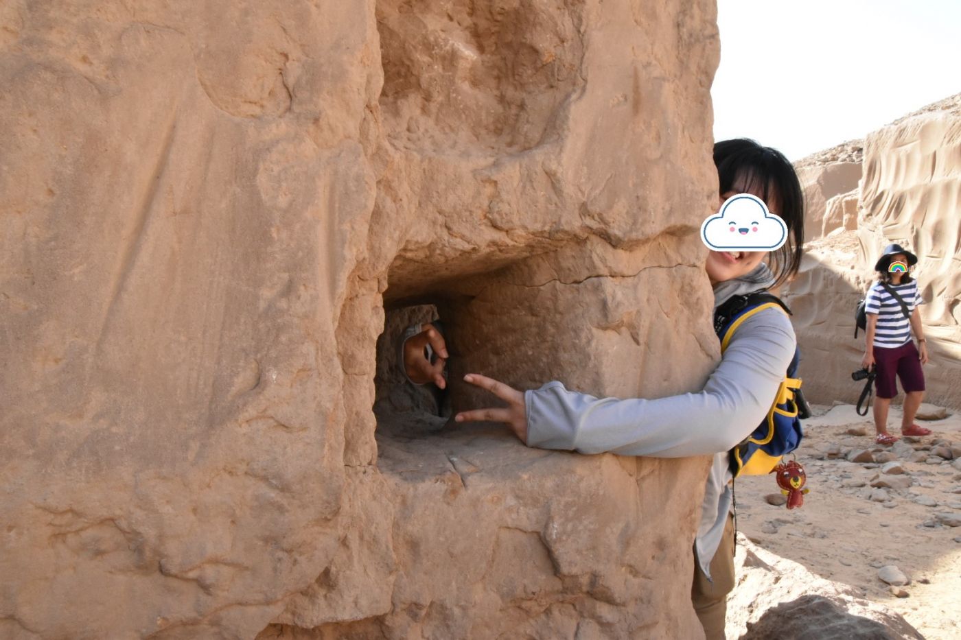 พอเดินไปจุดสุดเหมือง ก็เจอกับทางออกสู่แม่น้ำอีกทาง บางคนดูจนเบื่อแล้วก็เริ่มเดินกลับเรือ แต่ฉันหันไปเจอคุณป้าคนหนึ่งกำลังถ่ายรูปกับกำแพงหินที่มีรูโหว่อยู่ มันคงจะไม่น่าขำถ้าคุณป้าเขาไม่ได้กำลังพยายามยัดหัวตัวเองเข้าไปในรูนั้นแล้วให้เพื่อนถ่ายรูปให้จากอีกฝั่งหนึ่งของรู เจ้ารูโหว่นั้นเป็นเหมือนกำแพงหินที่มีรูทะลุไปอีกฝั่ง พี่โอ๊ตบอกว่าเป็นรูที่เอาไว้คล้องสมอเรือไม่ให้เรือขยับ เฉียบมาก!