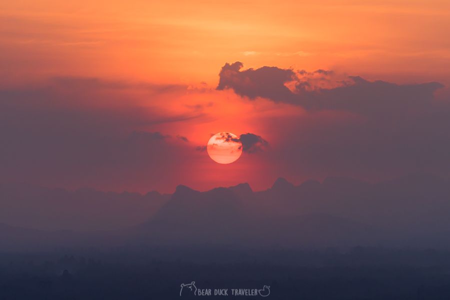 เราลงทุนตื่นตีห้านิดๆ ซิ่งจากโรงแรมอย่างรวดเร็ว รอบข้างยังมืดสนิทเมื่อถึงจุดหมาย มีชาวบ้าน ซึ่งอาจเป็นชาวประมงหรือชาวสวน นั่งจับกลุ่มผิงไฟกันข้างศาลาเก่าๆ รอไม่นานท้องฟ้าค่อยๆ สว่างขึ้น และเปิดให้เราเห็นว่า น...นั่นมันเมฆทั้งน้านนี่หว่า อาเจ้หันมาทำปากเบะใส่ ส่งกระแสจิตมาว่า “แกปลุกชั้นขึ้นมาทำไมห๊ะ”
