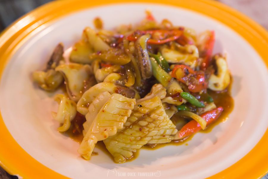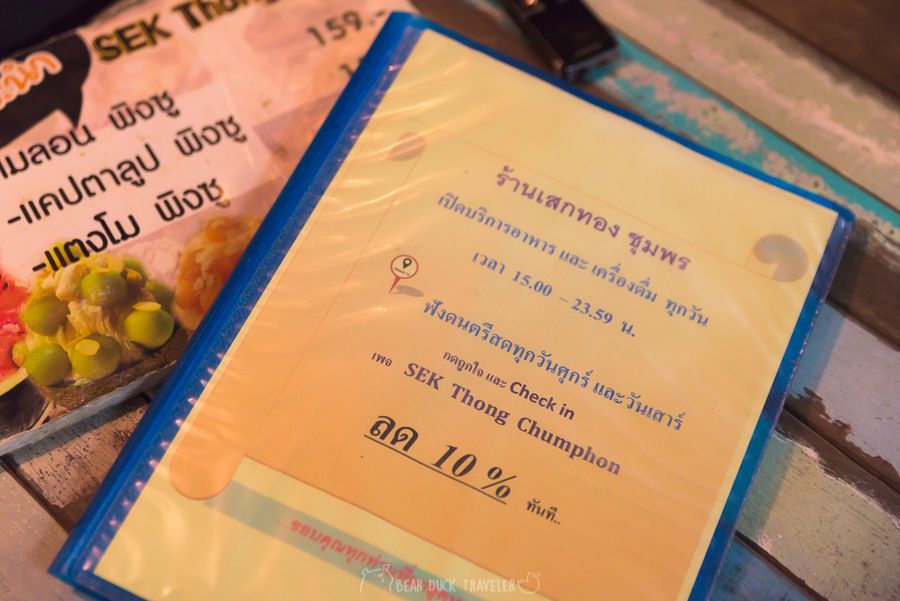 เสกทอง ชุมพร (Sek Thong Chumphin) ร้านอาหารที่ตั้งอยู่ใกล้กับ Retro Box Hotel พลิกๆ เมนูดูราคาไม่แพง เลยจัดไปตามนี้ฮะ ผักบุ้งไฟแดง ผักเหลียงผัดไข่ หมึกผัดพริกเผา กระเพราไก่ราดข้าว ทุกจานอร่อยได้มาตรฐาน ปลาหมึกสดเด้งถูกใจ มีส้มหวานๆ ให้กินตบท้ายอีกต่างหาก