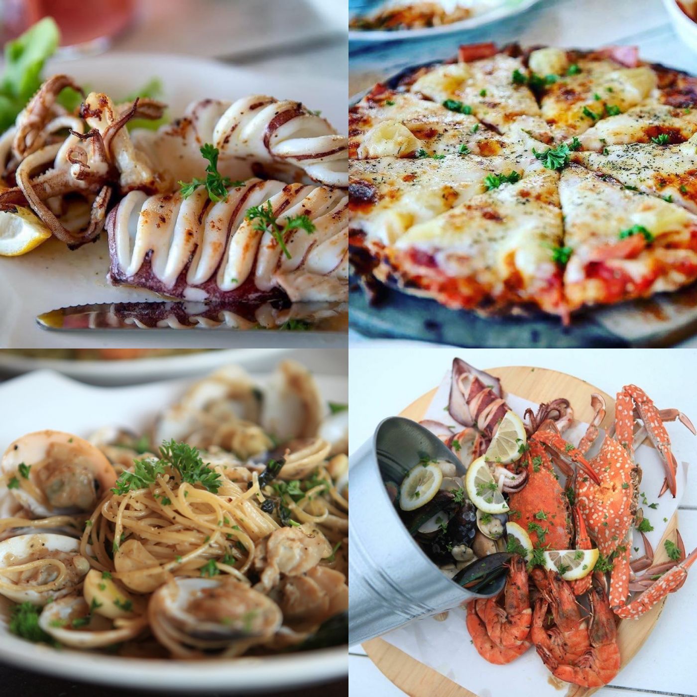 อาหารในร้านเป็นสไตล์ซีฟู้ดไทย-อิตาเลียน ตัวอย่างเมนูอาหารไทยจะมี ต้มข่าไก่ ต้มยำกุ้ง ต้มแซ่บปลากระพง ส้มตำกุ้งย่าง อาหารซีฟู้ดมีรวมทะเลย่างน้ำมันมะกอก กุ้งอบซอสไวน์ขาว ยำทะเลรวม เนื้อปูผัดผงกระหรี่ ส่วนอาหารอิตาเลียนจะมีสปาเกตตีวองโกเล่หอยตลับ มาการ์เร็ตตาร์ ฮาวาเอียน พิซซ่าแอน์โชวี่ เป็นต้น โดยอาหารของทางร้านปรุงรสอย่างกลมกล่อมลงตัว เหมาะสมกับราคา