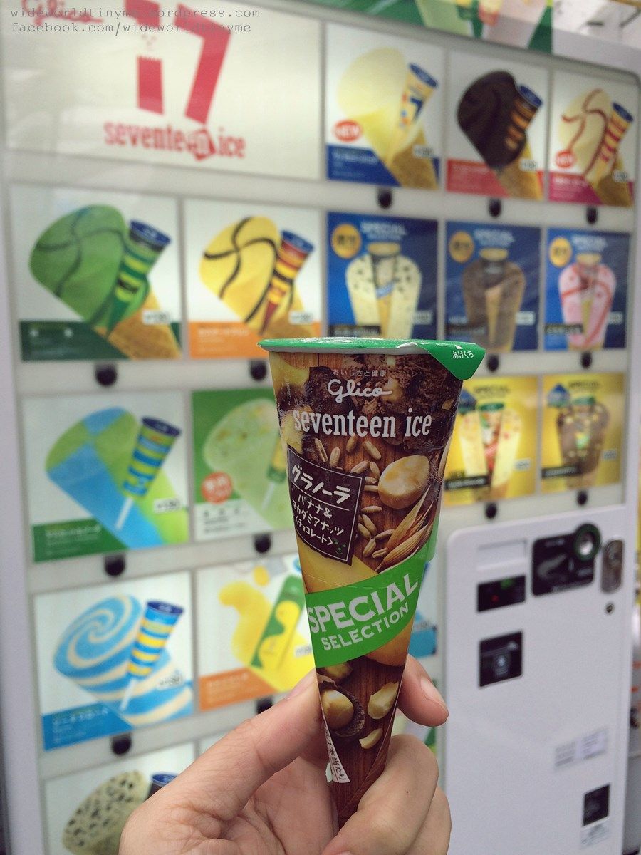 ฉันเลือกกินไอติมโคน เพราะเป็นแนวไอติมแบบที่ถูกใจ เนื่องจากชอบแทะโคนไอติมนี่แหละ รสที่เลือกก็คือรสที่ออกมาใหม่ แถมหลังจากนั้นไปเจอตู้ไอติมกูลิโกะที่อื่น รสนี้บางทีก็ไม่มี ไม่ก็หมด รสที่ว่าคือช็อคโกแลตกับกล้วยและอัลมอนด์ อยากจะบอกว่า อร่อยๆ ที่น่าทึ่งคือ โคนไม่มีนิ่มเนิ่ม กินแล้วก็สัมผัสถึงความกรอบ ตัวไอติมก็เข้มข้นด้วยช็อคโกแลต แซมด้วยกล้วยและกรุบกรอบกับถั่ว ชอบที่มันไม่หวานเกินไป ซึ่งเอาเข้าจริงๆ ฉันว่ามันเป็นคุณลักษณะของขนมหวานที่ญี่ปุ่น คือหวานนะ แต่ไม่หวานเกินไป ว่าแต่ที่พูดถึงเนี่ยคือขนมในประเทศญี่ปุ่นแบบแนวต่างชาติ ไม่ได้นับรวมขนมญี่ปุ่นแบบทานกับชานะ (อันนั้นเท่าที่ลองมา หวานนำมาล่ะ เพื่อตัดกับความขมของชา)