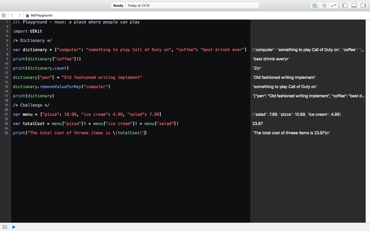 - เอา dictionary ออกด้วยการระบุชื่อ key ด้วย removeValueForKey("key")