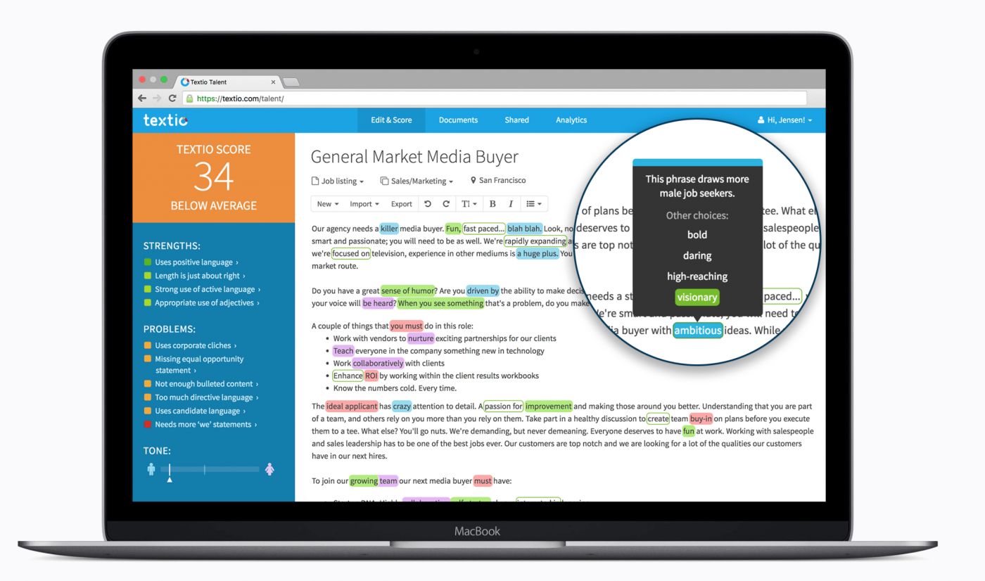 Textio เป็นการใช้ปัญญาประดิษฐ์มาช่วยพัฒนางานเขียนเช่นเดียวกัน แต่เป็นงานเขียนประเภทที่จำกัดหน่อย นั่นคืองานเขียนประกาศรับสมัครงาน โดยอินเทอร์เฟซของ Textio จะไม่ต่างจากโปรแกรมเขียนอย่างเช่น Pages หรือ Google Docs แต่ว่าที่พิเศษคือเมื่อผู้ประกาศรับสมัครงานใน Textio พิมพ์ไปเรื่อยๆ ตัวโปรแกรมจะไฮไลต์บางคำเพื่อให้เปลี่ยน หรือบางคำ เพื่อชมว่าใช้แบบนี้ดีอยู่แล้ว ด้วยการวัดผลทางสถิติด้วย (เขาเรียกว่าเป็น "เครื่องมือทำนาย" หรือ predictive engine)