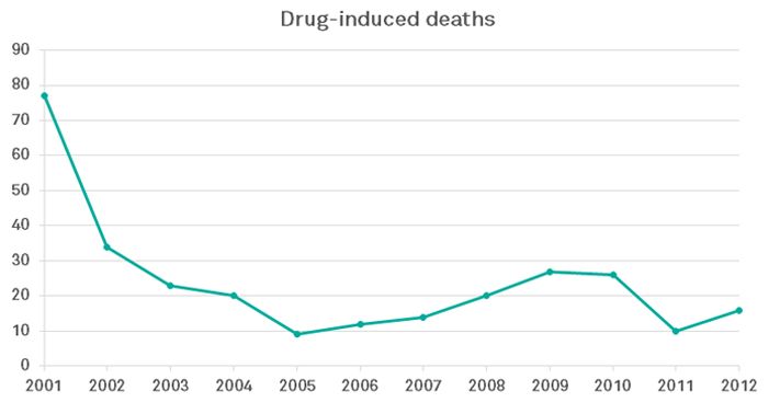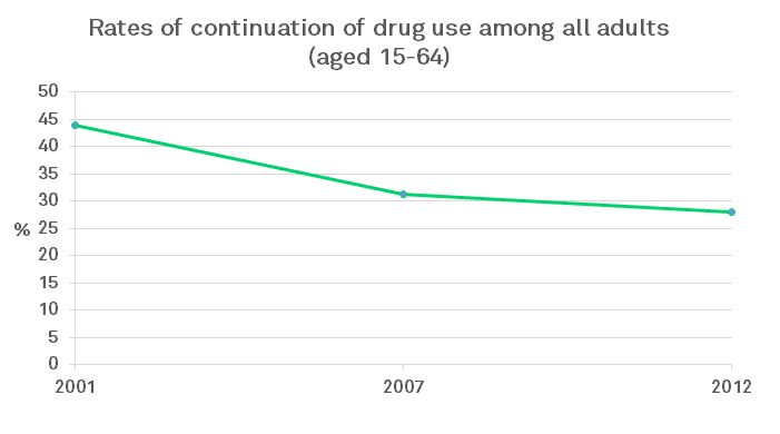 ตอนนี้ 15 ปีหลังจากที่ decriminalize drug แล้ว ก็พบว่ามีการใช้ยาเสพติดลดลงตามกราฟ (สำรวจถึงปี 2012) มีการตายที่เกิดจากยาเสพติดลดลง (หลังๆ ทำไมเพิ่มไม่รู้) และมีอัตราการติดเชื้อ HIV จากการใช้เข็มฉีดยาเสพติดลดลง
