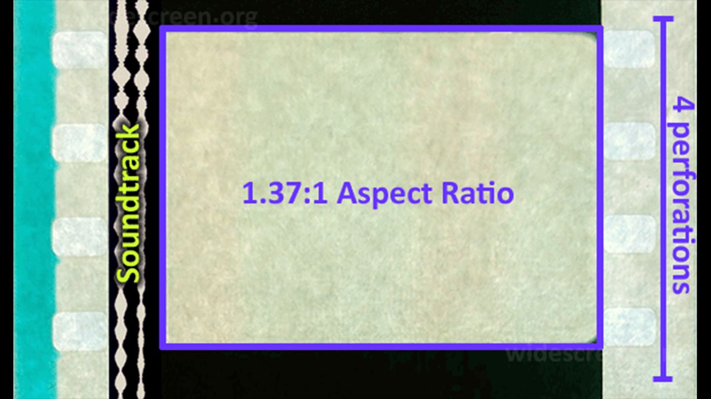 Silent film (1.33:1) ต่อมาในปี 1892 วิลเลี่ยม เค แอล ดิคสัน ลูกน้องของโทมัส เอดิสัน ได้ประดิษฐ์ฟิล์มเซลลูลอย ที่ทำจากพลาสติกชนิดหนึ่ง ขนาดความกว้าง 35 มม. และมีรูที่ด้านข้าง 4 รู (ภาษาชาวบ้านเรียก รูหนามเตย) เพื่อใช้ในการถ่ายภาพเคลื่อนไหวและถ่ายทำฟุตเตจนึงออกมา ชื่อ Blacksmith Scene เป็นหนังเงียบความยาว 34 วินาที ใช้สัดส่วนภาพ 1.33:1 เพราะตรงกับความกว้างของฟิล์มและขนาดของรูรับแสงของกล้องพอดี การฉายภาพในขณะนั้นจะใช้เครื่องฉายที่เรียกว่า ไคเนโตสโคป
