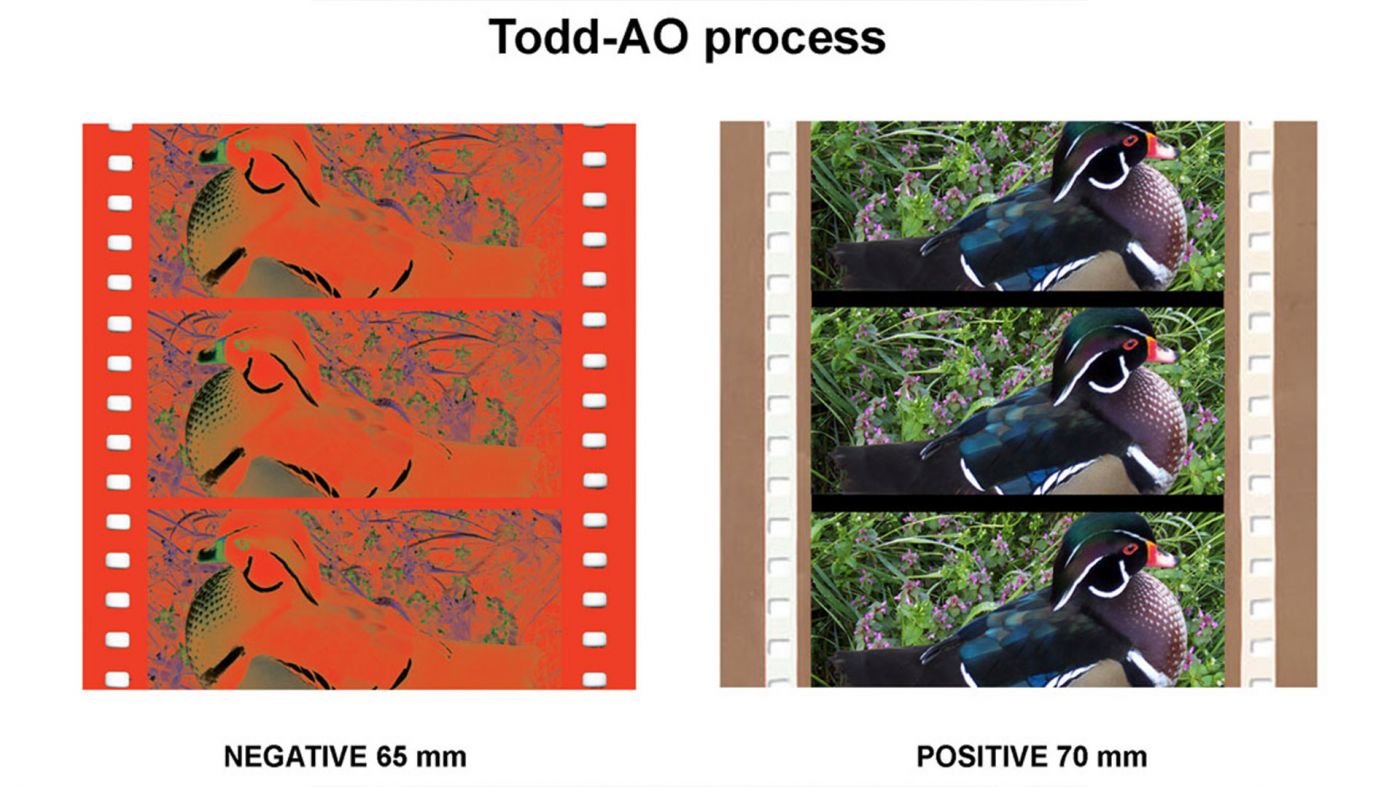 65/70mm (2.20:1) ปี 1955 บริษัท ทอดด์เอโอ ได้มีการนำฟิล์มถ่ายหนังแบบเนกาทีฟขนาด 65 มม. มาใช้ในการถ่ายทำภาพยนตร์ และฟิล์มแบบโพสิทีฟขนาด 70 มม. เพื่อใช้ในการฉาย ซึ่งมีขนาดใหญ่กว่าฟิล์ม 35 มม. ถึง 2 เท่า โดยให้สัดส่วนภาพที่ 2.20:1 โดยไม่ต้องใช้เลนส์อนามอร์ฟิกเพื่อขยายความกว้าง เรียกฟอร์แมตนี้ว่า Todd-AO หนังเรื่องแรกที่ใช้สัดส่วนนี้คือ Oklahoma! ต่อมาปี 1957 บริษัท MGM และพานาวิชั่น ได้พัฒนาฟอร์แมตฟิล์ม 65/70 มม. มาใช้ในการถ่ายหนัง ใช้ชื่อว่า Super Panavision 70 โดยที่สเปคต่างๆ ไม่ต่างจาก Todd-AO เท่าไหร่ หนังดังๆ ที่ถ่ายทำด้วยฟอร์แมตนี้คือ Ben-Hur (1959), The Sound of Music (1965) และล่าสุดคือ Dunkirk (2017) ของคริสโตเฟอร์ โนแลน (ฉากที่ไม่ได้ถ่ายทำด้วยกล้อง IMAX)