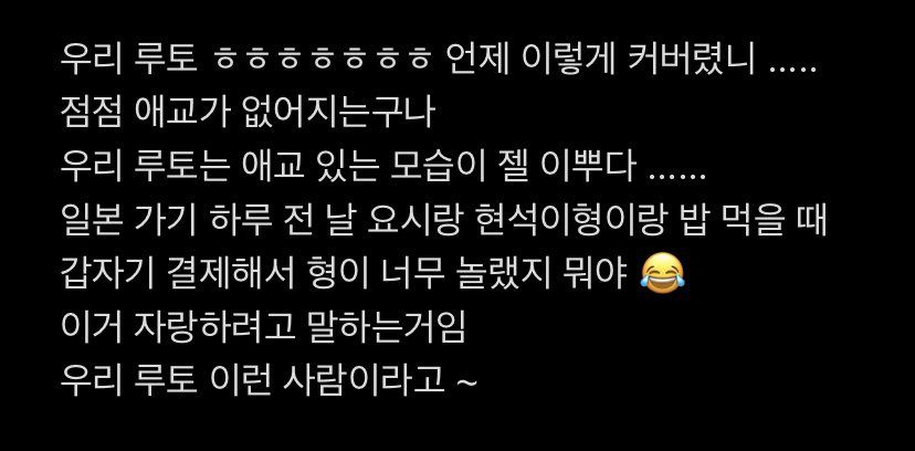 "루토야!! 일단 생일 진짜 너무너무 축하하고 항상 열심히 해줘서 고맙다!앞으로도 우리 이렇게 재밌게 계속 활동하자! 사랑한다"