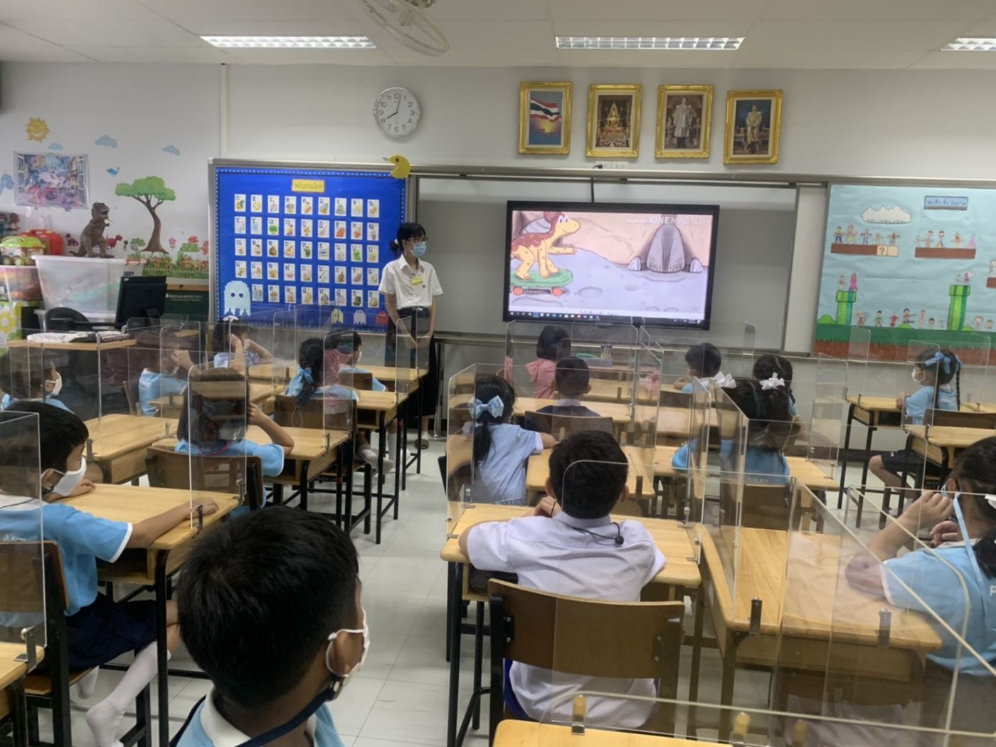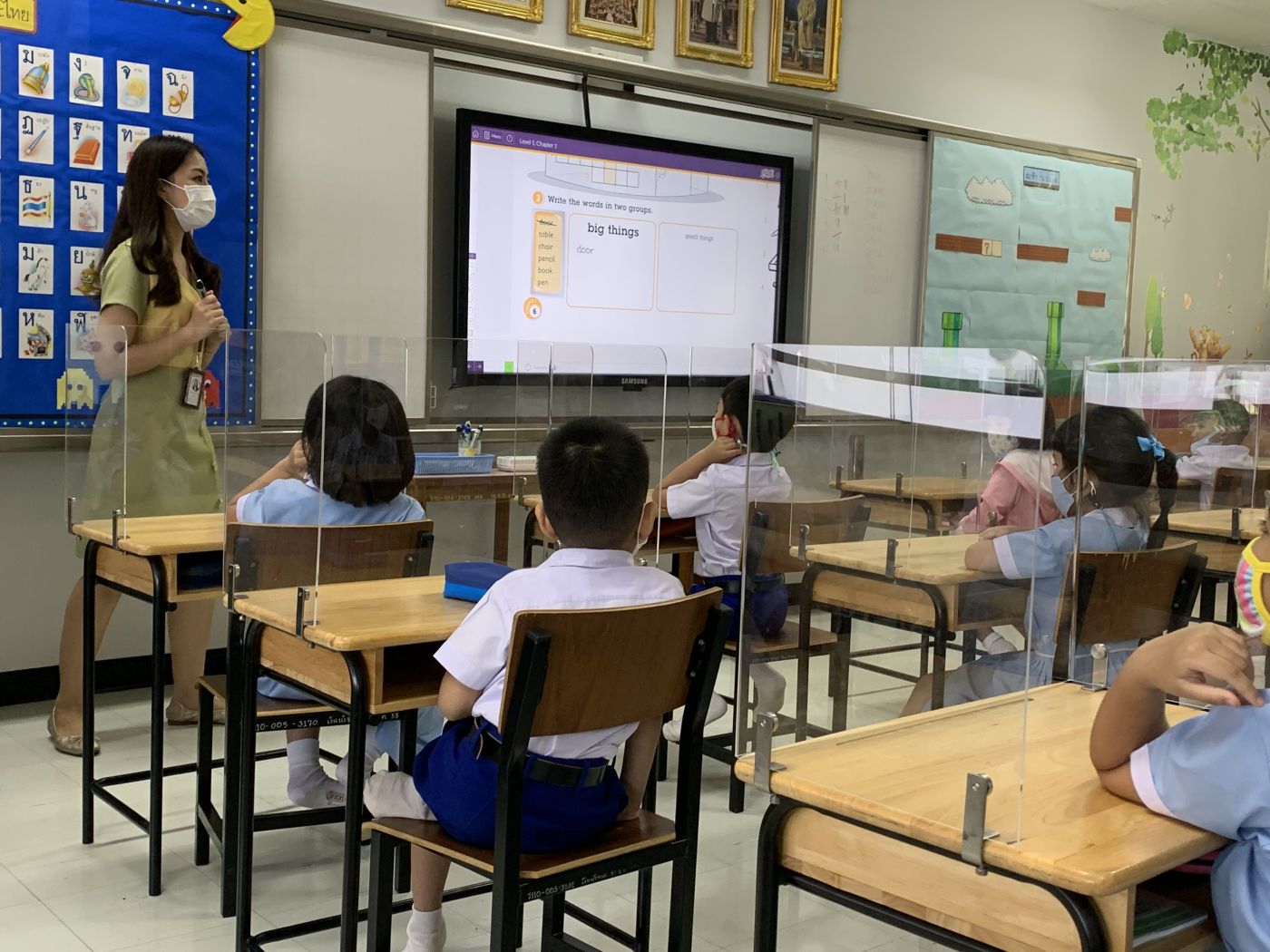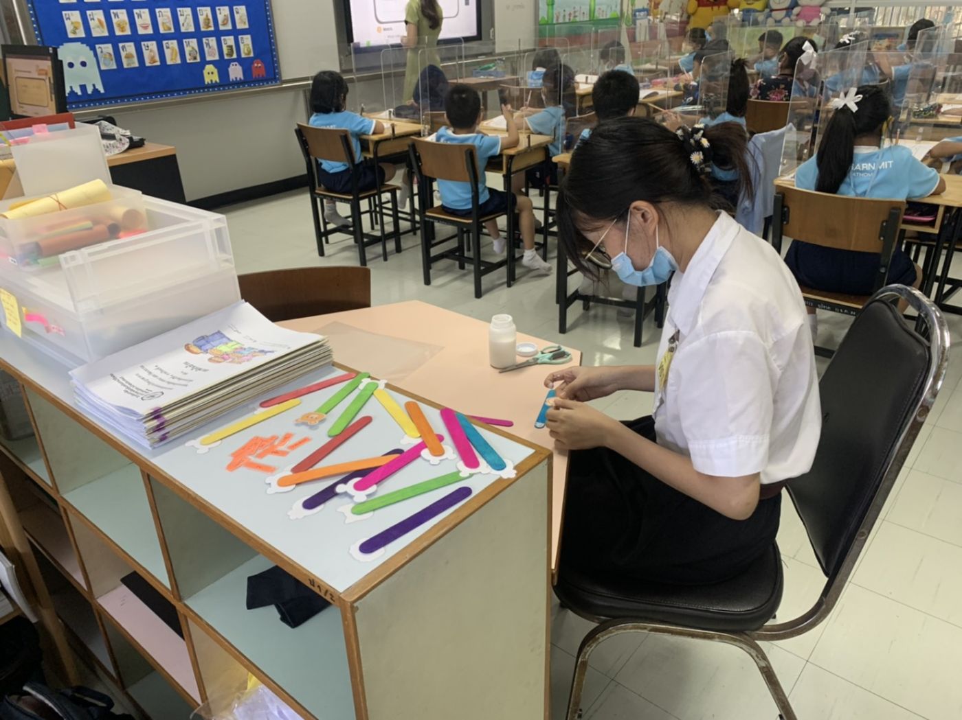 นอกจากเราต้องช่วยจัดการเรื่องรายละเอียดเล็ก ๆ ในห้อง เช่น เขียนหมายเลขรองเท้าสำหรับใส่บนอาคาร จัดของวิชาลูกเสือ ทำป้ายชื่อต่าง ๆ ก็ต้องคอยดูแลเด็ก ๆ ในระหว่างจดการบ้าน ทำงาน ระหว่างพักดื่มน้ำและพักกลางวัน มีบางวิชาที่ต้องไปเรียนข้างนอกถ้าคุณครูไม่ได้มารับ พวกเราก็ต้องไปส่งเด็ก ๆ ที่ห้องจึงต้องคอยดูเรื่องการจัดแถว การวางรองเท้า และที่สำคัญคือการต้องคอยดูเรื่องการใช้เจลล้างมือ ใส่หน้ากากเพื่อนีกษามาตรการป้องกันโควิดให้ดีที่สุดแม้จะไม่ได้เรียนออนไลน์ก็ตาม