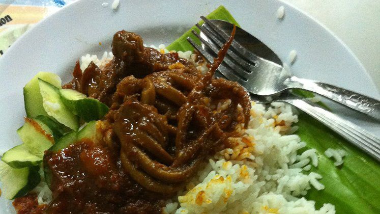 เกือบเที่ยงคืน แต่คนก็ยังแน่นร้านขาย Nasi Lemak แปลตรงตัวว่า ข้าวเยิ้มๆ แปลจริงๆ ว่า ข้าวราดแกง