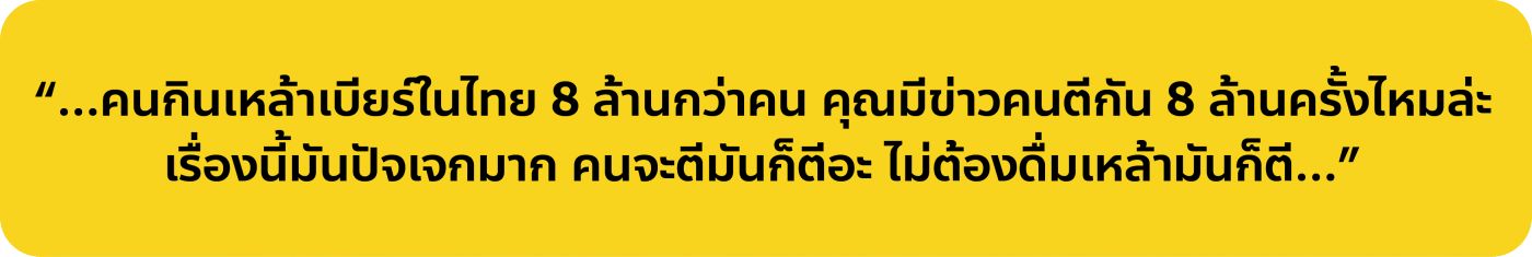 “ประเทศไทยเป็นประเทศที่เอาศาสนาไปโยงกับทุกเรื่องอยู่แล้ว ศาสนาพุทธถูกจับกับทุกเรื่องโดยไม่มีเหตุผล เป็นเรื่องของอำนาจทางความเชื่อ เรื่องเหล้าเบียร์บุหรี่มันก็เลยโดนไปด้วย คือพี่มองว่า ประเทศเราก็ไม่ใช่รัฐศาสนา แต่พอจะออกข้อห้ามว่าห้ามขายเหล้าเบียร์วันนั้นวันนี้ เอาวันศาสนามาทำไมวะ กูเป็นคริสต์ ทำไมกูต้องกินตามมึง ห้ามขายตามมึง มันเป็นภาระมาก ห้ามขาย 14.00-17.00 น. เช่าร้านมาทั้งวันแต่มีช่องโหว่ตรงนี้ เพราะอะไร เคยตั้งคำถามไหม กฎหมายที่ใช้อยู่ คือมันไม่มีเหตุมีผลเลย แล้วคนในสังคมก็โดนกล่อมอย่างเป็นกระบวนการมาตลอด”