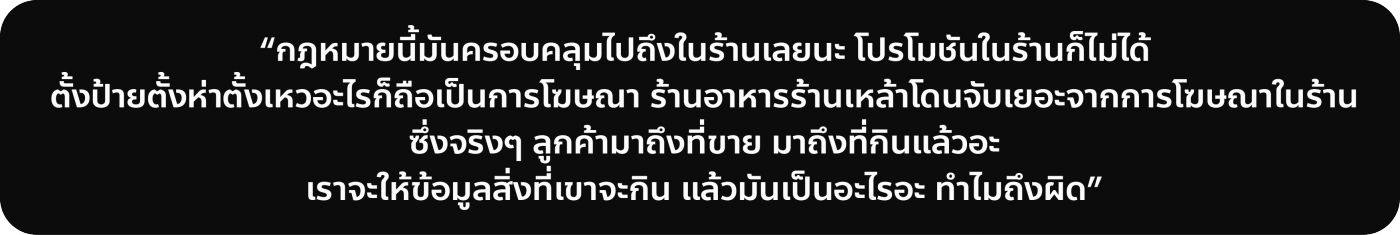 “เราไปนั่งอ่านรายงานการประชุมก่อนออกกฎหมายนี้ แล้วปรากฏว่ามันเป็นยุคที่ไม่มีฝ่ายค้าน อะ หนึ่งเลยคือที่มามันไม่มีความเป็นประชาธิปไตย สองคือ โครงสร้างของคณะนโยบาย ไม่มีส่วนร่วมของผู้ประกอบการ คนทำงานจริง หรือคนที่แก้ปัญหาตรงจุดเลย และสาม คือ อำนาจในการออกกฎหมายใหม่ของคณะนโยบายง่ายมาก อยากเสนอกฎหมายใหม่ก็เสนอ เพราะฉะนั้น มันเลยมีกฎหมายประเภท วันเวลาห้ามจำหน่ายแอลกอฮอล์ ห้ามออนไลน์ ห้ามขายวันนู้นวันนี้ โผล่มาเรื่อยๆ โผล่มาทุกปี เหมือนเป็นKPI พอออกมาเป็นกฎหมายแล้ว เราก็แย้งไม่ได้”