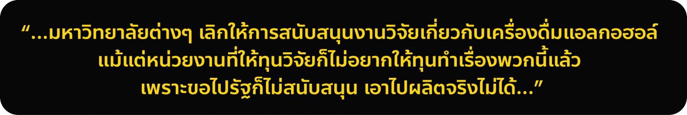 " ผมมองว่าเป็นทางอ้อม คือกฎหมายนี้มันเกิดหลังโฆษณาสสส. ซึ่งค่านิยมที่มองว่าเหล้าเบียร์มันไม่ดีก็มาพร้อมกับสสส.นี่แหละ ซึ่งทำให้มหาวิทยาลัยต่างๆ เลิกให้การสนับสนุนงานวิจัยเกี่ยวกับเครื่องดื่มแอลกอฮอล์ แม้แต่หน่วยงานที่ให้ทุนวิจัยก็ไม่อยากให้ทุนทำเรื่องพวกนี้แล้ว เพราะขอไปรัฐก็ไม่สนับสนุน เอาไปผลิตจริงไม่ได้ ทำให้งานวิจัยเกี่ยวกับการผลิตเครื่องดื่มแอลกอฮอล์ที่เกิดขึ้นในมหาวิทยาลัยมีน้อยลง คุณไปเสิร์ชในเว็บไซต์รวมงานวิจัยได้เลย ตั้งแต่ปี 2550 มา แทบไม่มีหรือมีน้อยมาก เพราะไม่ได้รับการสนับสนุน แต่ก่อนงานวิจัยเกี่ยวกับผลิตเครื่องดื่มแอลกอฮอล์มีเยอะมาก แต่นักวิจัยไม่มีโอกาสเอาไปต่อยอด การวิจัยการพัฒนาในสถาบันการศึกษามันน้อยลงตั้งแต่สสส. เข้ามา เพราะเขาสร้างสภาพให้สิ่งแวดล้อมไม่เอื้อต่อการวิจัยพัฒนาเรื่องนี้ ”