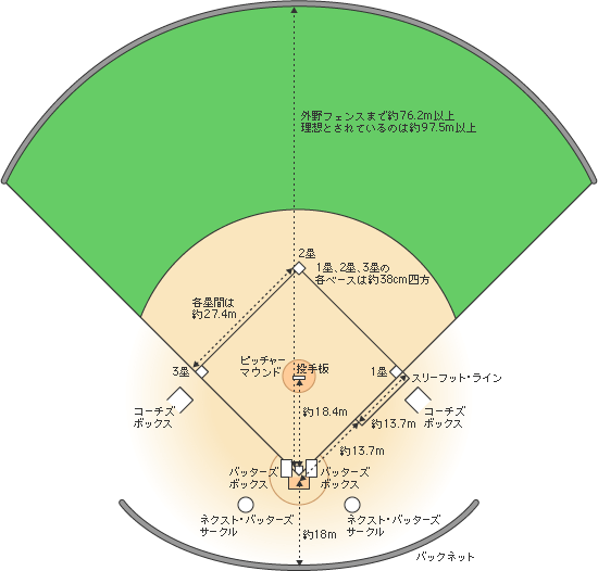 ** 満塁 3点ビハインド = เต็มเบส และตามหลังอยู่ 3 คะแนน คือ เวลาเล่นเบสบอลพอตีลูกแล้วต้องวิ่งไปเหยียบเบส (แผ่นสีขาวที่อยู่ตามจุด1,2,3 ในรูป มี 3 เบส) โดยที่ต้องระวังไม่ถูกผู้เล่นฝั่งตรงข้ามเอาลูกเบสบอลมาแตะตัว ถึงจะรักษาชีวิตในเกมไว้ได้ สถานการณ์ตอนนี้สำคัญมาก หมายความว่าคนที่จะตีลูกคนต่อไป ถ้าตีลูกยากๆ หรือตีออกไปไกลๆ จนฝ่ายตรงข้ามรับลูกไม่ได้ ผู้เล่นที่เต็มเบส 3 คนฝั่งตัวเองก็มีโอกาสวิ่งกลับมาที่ฐานเข้าโฮม(บริเวณเดียวกับที่ไปยืนตีลูก) ได้คะแนนกลับมาตีตื้น อาจจะเอาชนะฝ่ายตรงข้ามได้สำเร็จ
