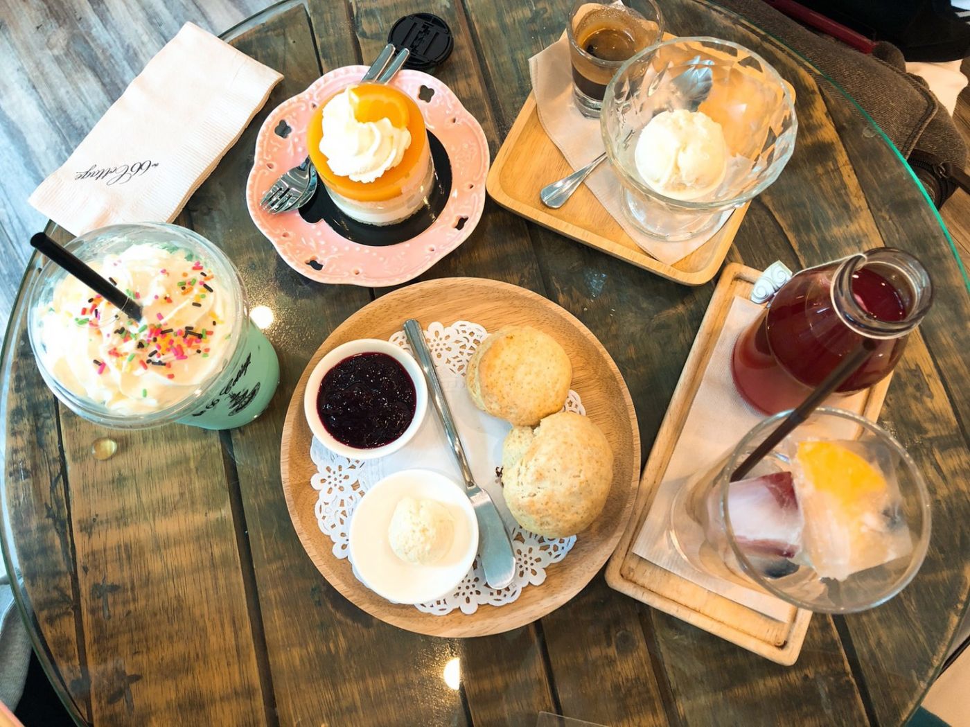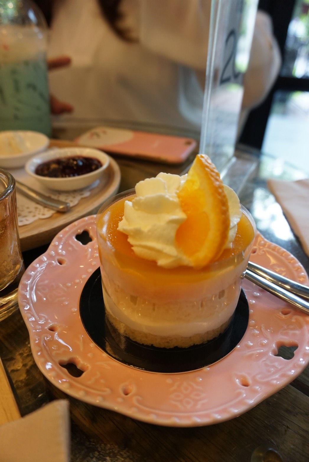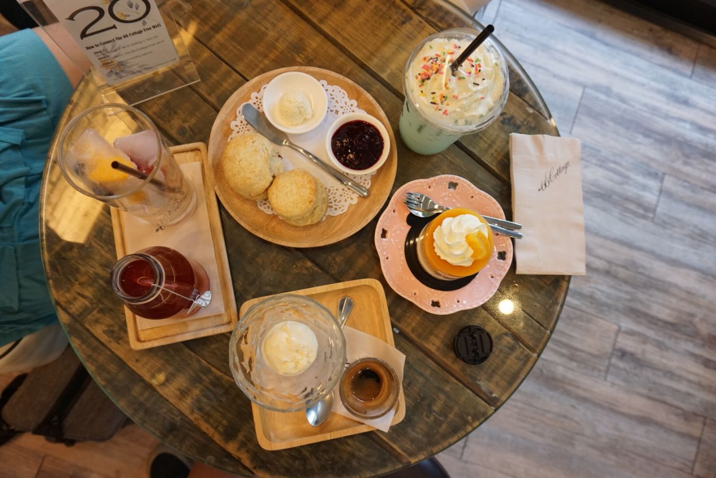 เมนูของหวานที่สั่งมีทั้งมัทฉะชีสเค้ก เค้กส้ม สโคน และคุกกี้ที่เสิร์ฟพร้อมกับไอศกรีม
