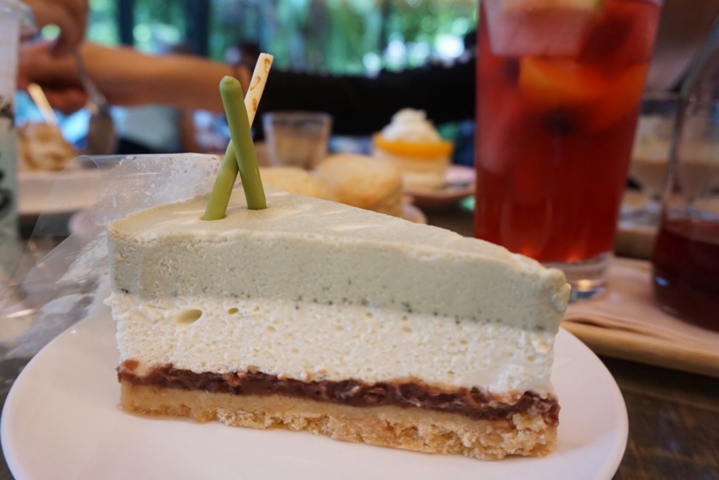 มัทฉะชีสเค้ก ชั้นบนสุดมัทฉะและชีสเค้กเนื้อนุ่มไม่หวานจนเกินไป ตามมาด้วยถั่วแดงกินตัดกับมัทฉะที่อร่อยเข้ากัน ด้านล่างสุดเป็นเนื้อแป้งกรุบๆ เวลารับประทานต้องทานพร้อมกันให้ครบทุกชั้น