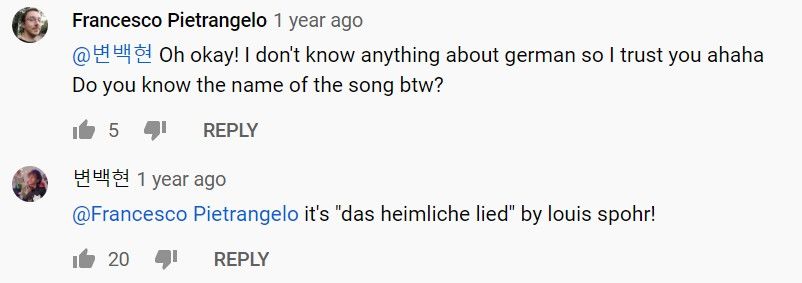 เพลงประกอบคลิป [] "one" ที่เราดูกันไปข้างต้น มีชื่อว่า Das heimliche Lied (The Secret Song) เป็นเพลงลำดับที่ 5 ในคอลเลกชั่น Sechs Deutsche Lieder (เพลงเยอรมันทั้งหก) Op. 103 ประพันธ์โดย Louis Spohr (1784-1859) นักประพันธ์เพลง วาทยกร และนักไวโอลินชาวเยอรมัน