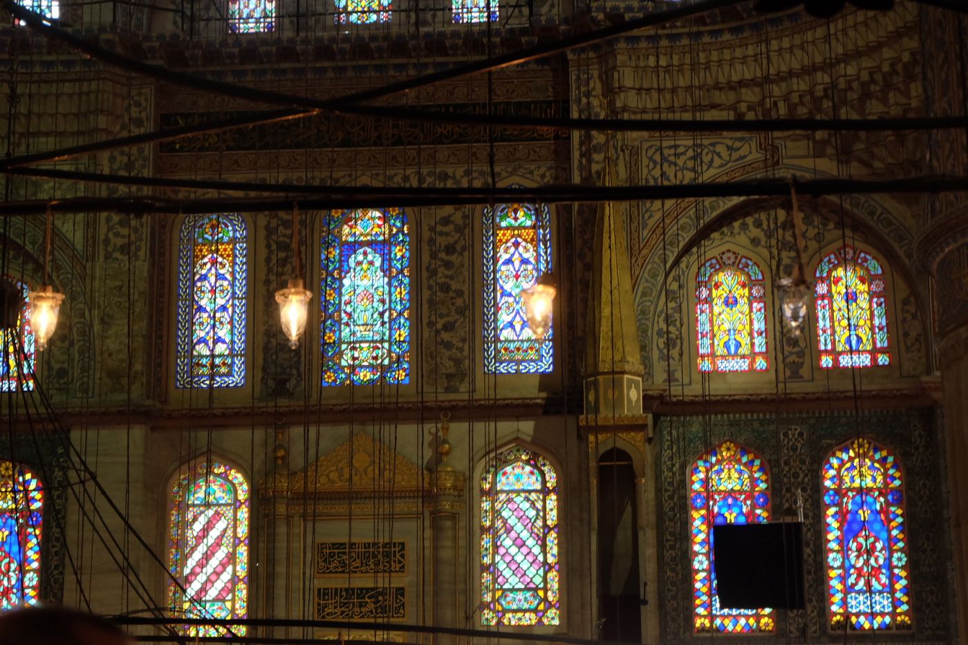 แม้จะเป็นมัสยิด แต่ภายในตกแต่งด้วยกระจกสีตามความนิยมของโบสถ์คริสต์ นอกจากนี้ยังมีการแบ่งสัดแบ่งส่วนเป็นโซนสำหรับนักท่องเที่ยวเพื่อไม่ให้รบกวนการทำพิธีของชาวมุสลิมอีกด้วย