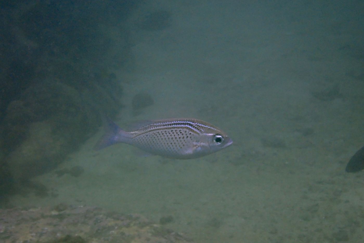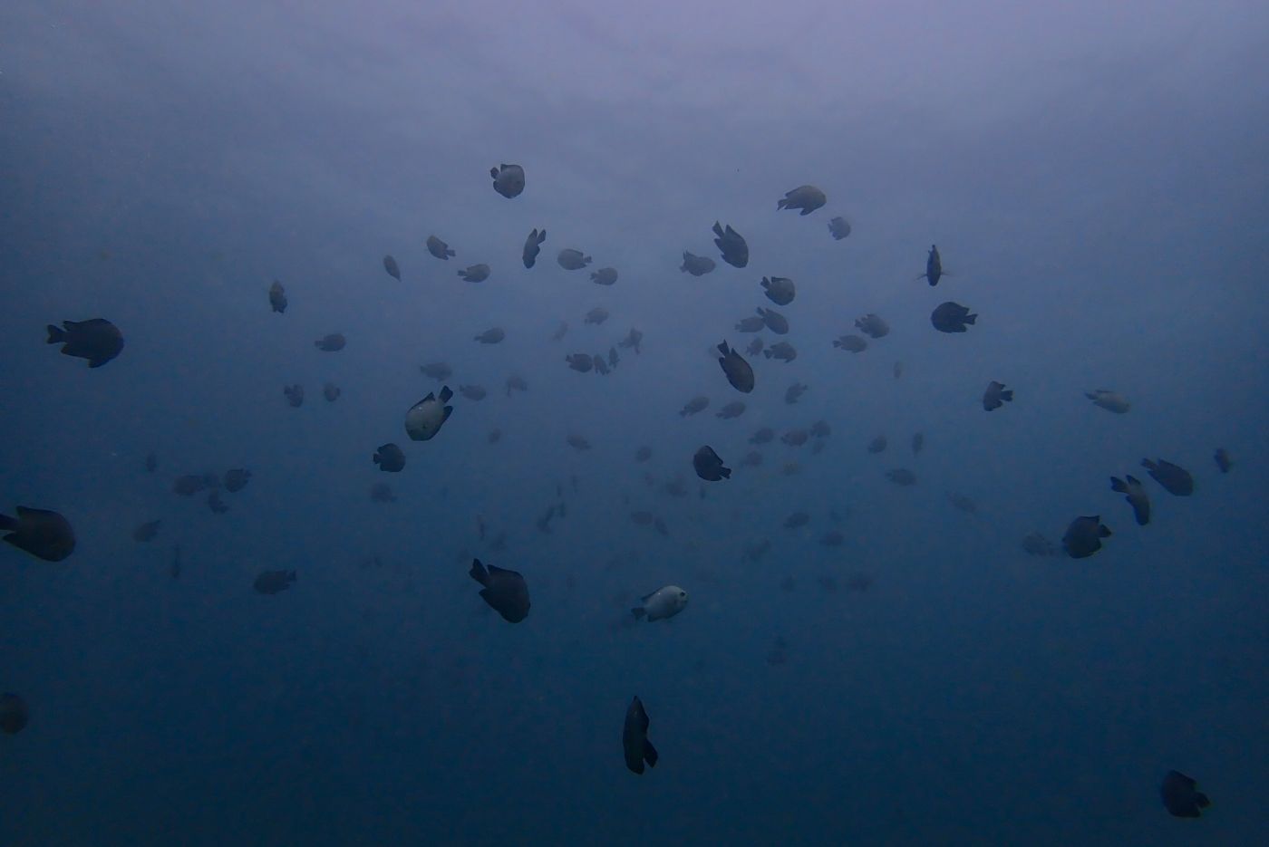 พอลงมาแล้วก็นึกดีใจว่าเดชะบุญที่ไม่ได้ไป Dibba Rock เพราะน้ำขุ่นไว้ใน น้ำใสให้ไปดำที่อื่นค่าาาาา โอ้ยยย มืดมิดมากๆ มองอะไรไม่เห็นเลย จริงๆ จุดนี้มีปลาฝูงเป็นหย่อมๆ แต่ถ่ายรูปออกมาก็มี แต่ตะกอนปลิวว่อนไปหมด แถมบุ๋งไปบุ๋งมาเริ่มคันยิบๆ เพราะคาดว่าไปป๊ะกับแตนทะเลเข้าให้