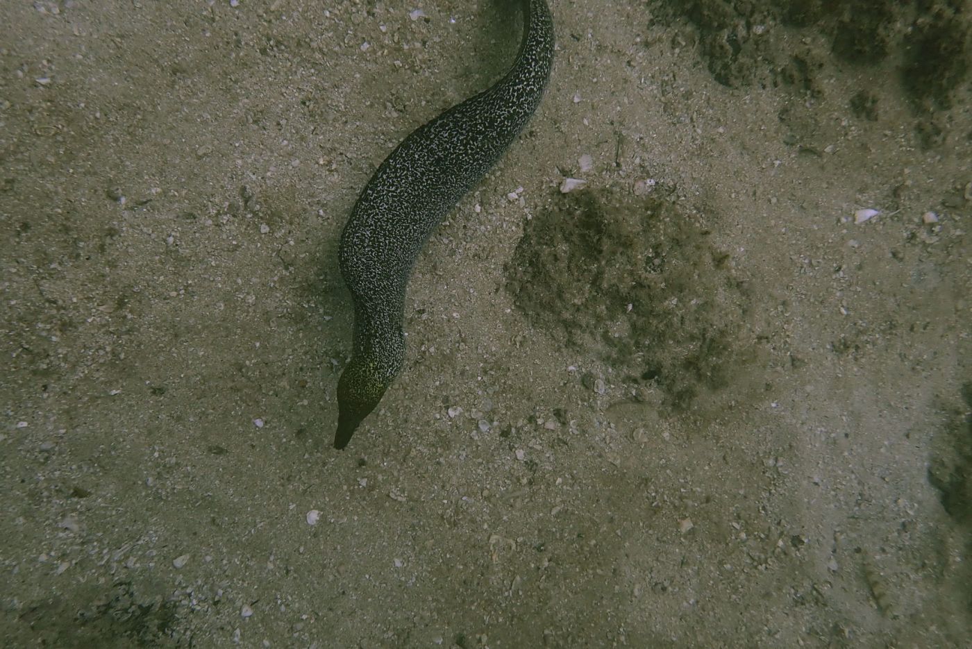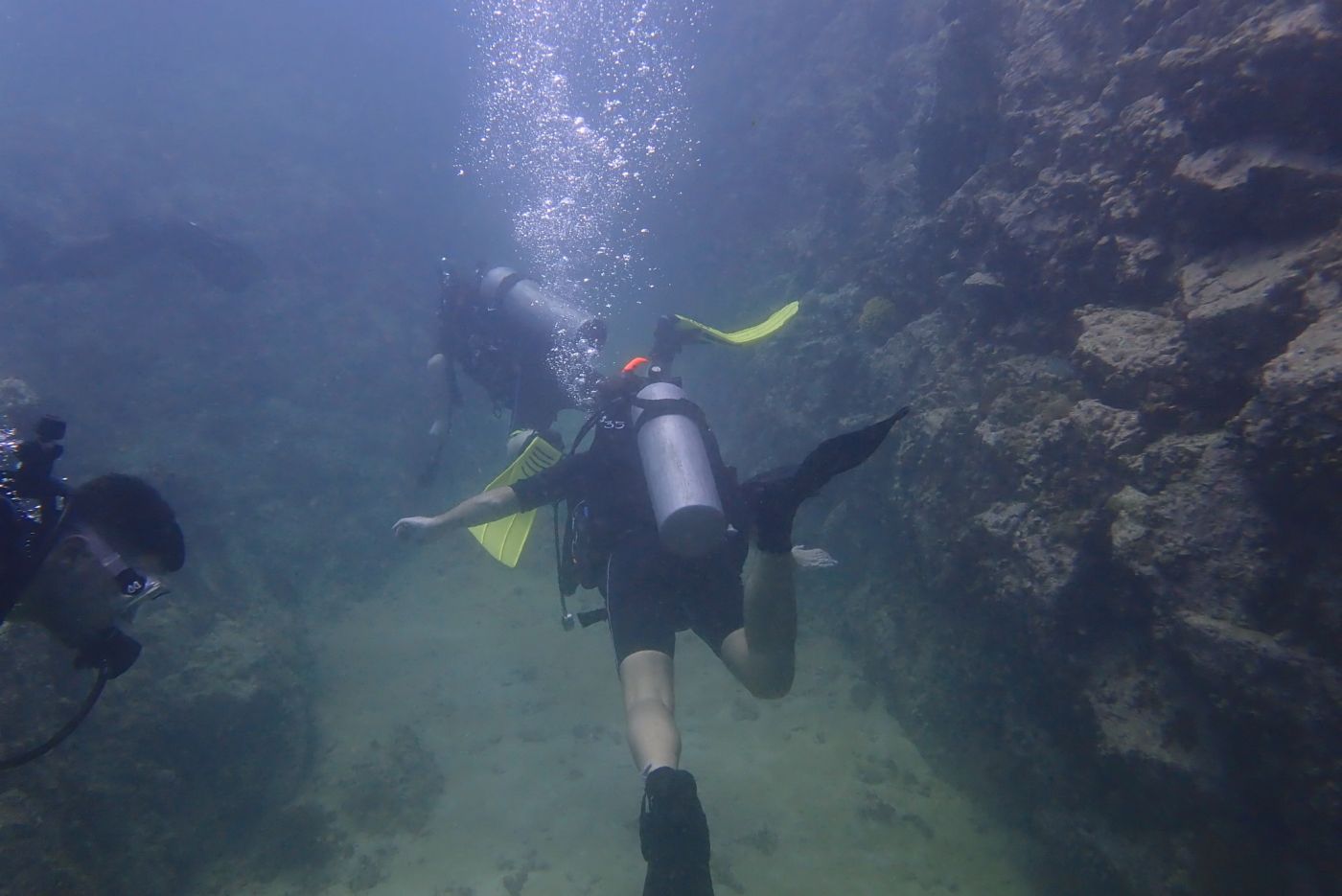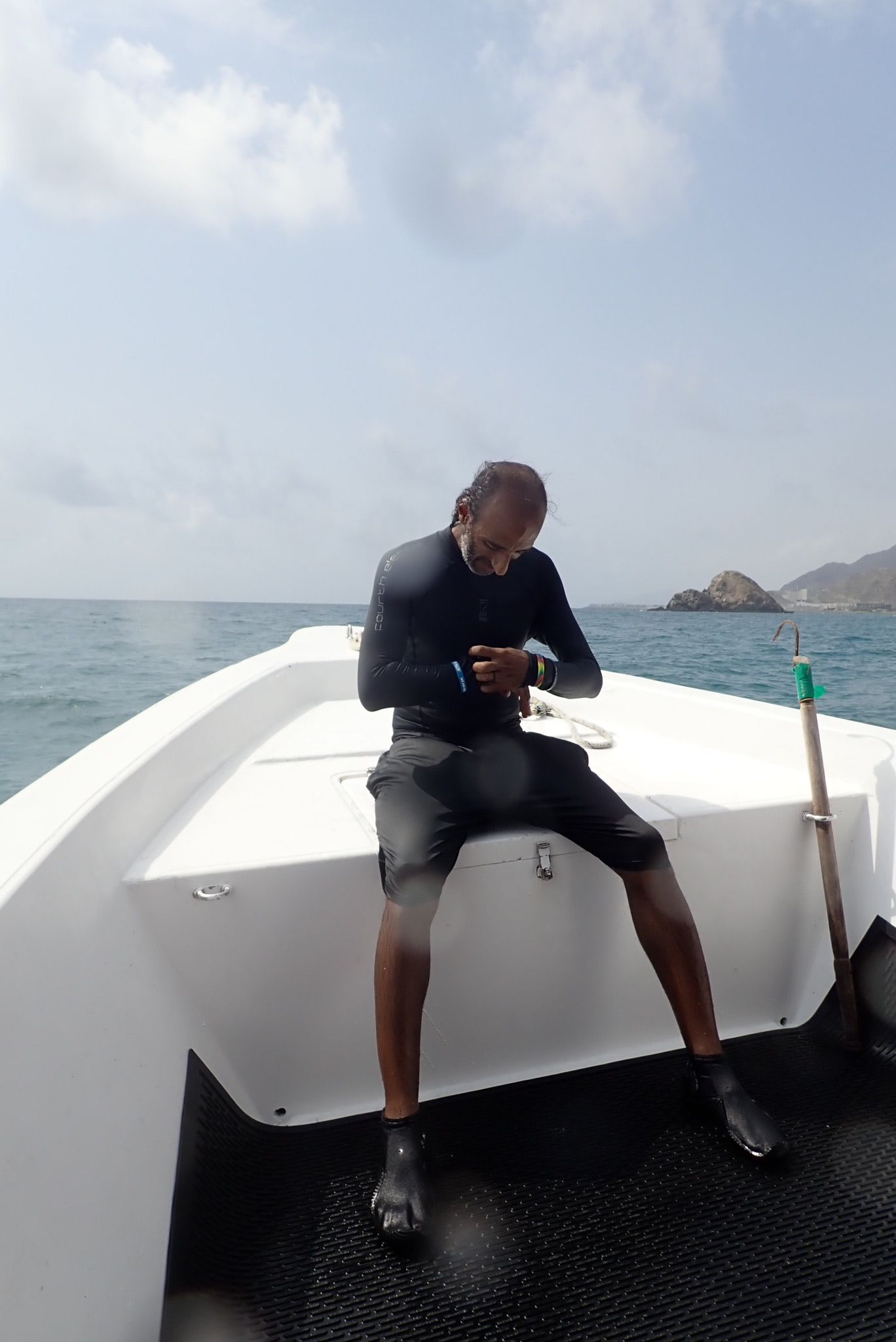 แรกเริ่มเดิมทีเราต้องนั่งเรือประมาณ 20 นาทีไปที่ Dibba Rock ซึ่งเป็นไดฟ์ไซต์ชื่อดังของที่นี่ เป็นจุดที่เจอปลานู้นปลานี้เยอะแยะ มีปะการังหลากหลายสวยงาม แต่ด้วยความที่สภาพทะเลเริ่มแปรปรวนเหมือนใจคนที่ปรวนเปร คลื่นเริ่มแรงขึ้นเรื่อยๆ เลยต้องย้ายมาที่ Three Rocks ที่อยู่ใกล้ชายฝั่งแทนค่ะ